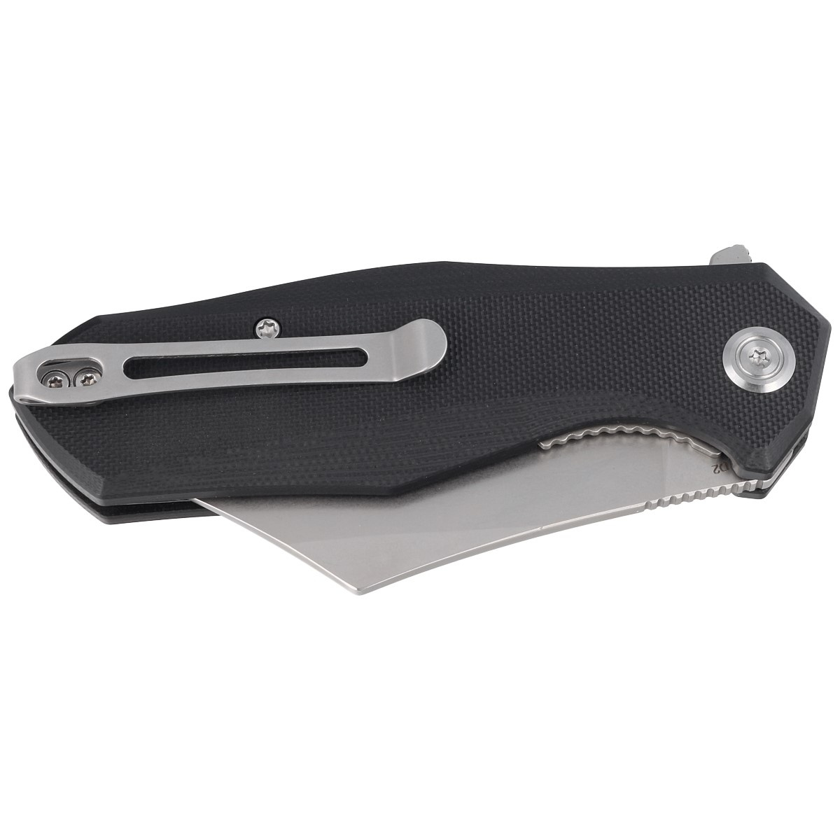 Handle - black G10 (pressure-pressed fiberglass with synthetic resin) facings, textured to improve grip confidence, bolted to the knife's steel frame. The so-called open-backed design without the typical backspacer, fastened together with steel spacers for easy cleaning. The simple, secure design gives assurance of many years of use. A fore finger groove improves grip security. The pivot axis is decorated with a stylized manufacturer's logo. A two-position (right/left) metal deep carry clip allows you to carry the knife discreetly in your pocket in tip-up position (blade tip up).