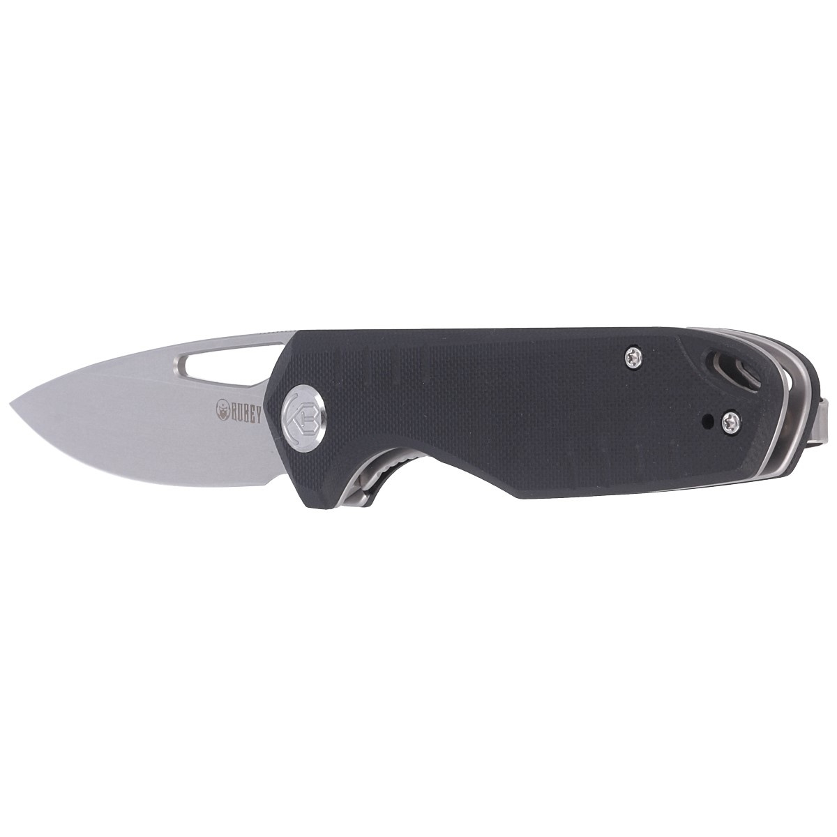 Handle - black G10 (pressure-pressed fiberglass with synthetic resin) facings, textured to improve grip security, bolted to the knife's steel frame. The open-backed design, so called, fastened together with steel spacer sleeves, reduces weight and makes cleaning easier. The simple, sturdy design gives assurance of many years of use. The pivot axis is decorated with a stylized manufacturer's logo. A two-position (right/left) metal deep-carry clip allows you to carry the knife discreetly in your pocket in tip-up position (blade tip up). Above the clip a lanyard hole, a hole for threading a safety or decorative cord.