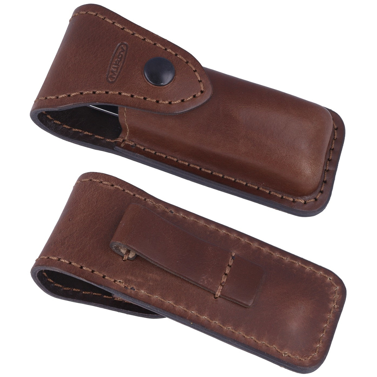Case - fastened with a Prym type snap. Made of high quality natural leather in brown color with embossed manufacturer's logo. The leather sheath has an attachment to the belt or the armor allowing to carry the knife in an upright position.