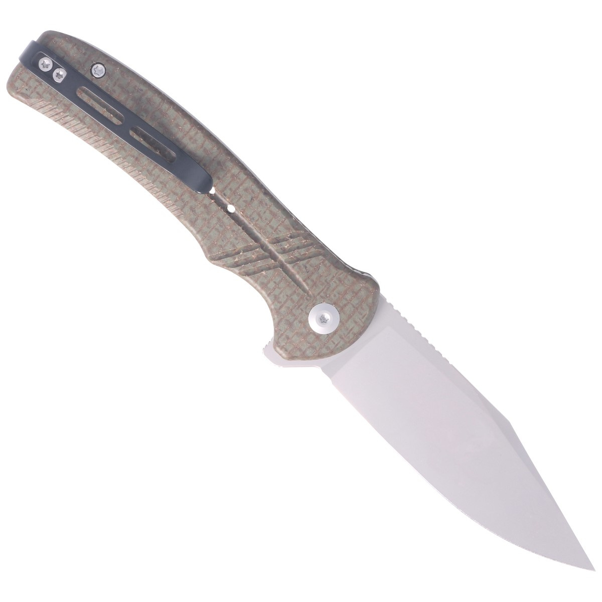 Handle - in dark green color. Made of micarta, a composite material of cotton or linen compressed with synthetic resin. Chamfered edges of the covers eliminate sharp edges for comfort, and jimping made on the front and back on the liners improves grip security. An open-backed design fixed with steel spacer sleeves reduces weight and facilitates cleaning. The pivot axle is decorated with a stylized Civivi brand logo. A two-position, right/left deep carry clip allows you to carry the knife discreetly in your pocket in tip-up position (blade tip up).