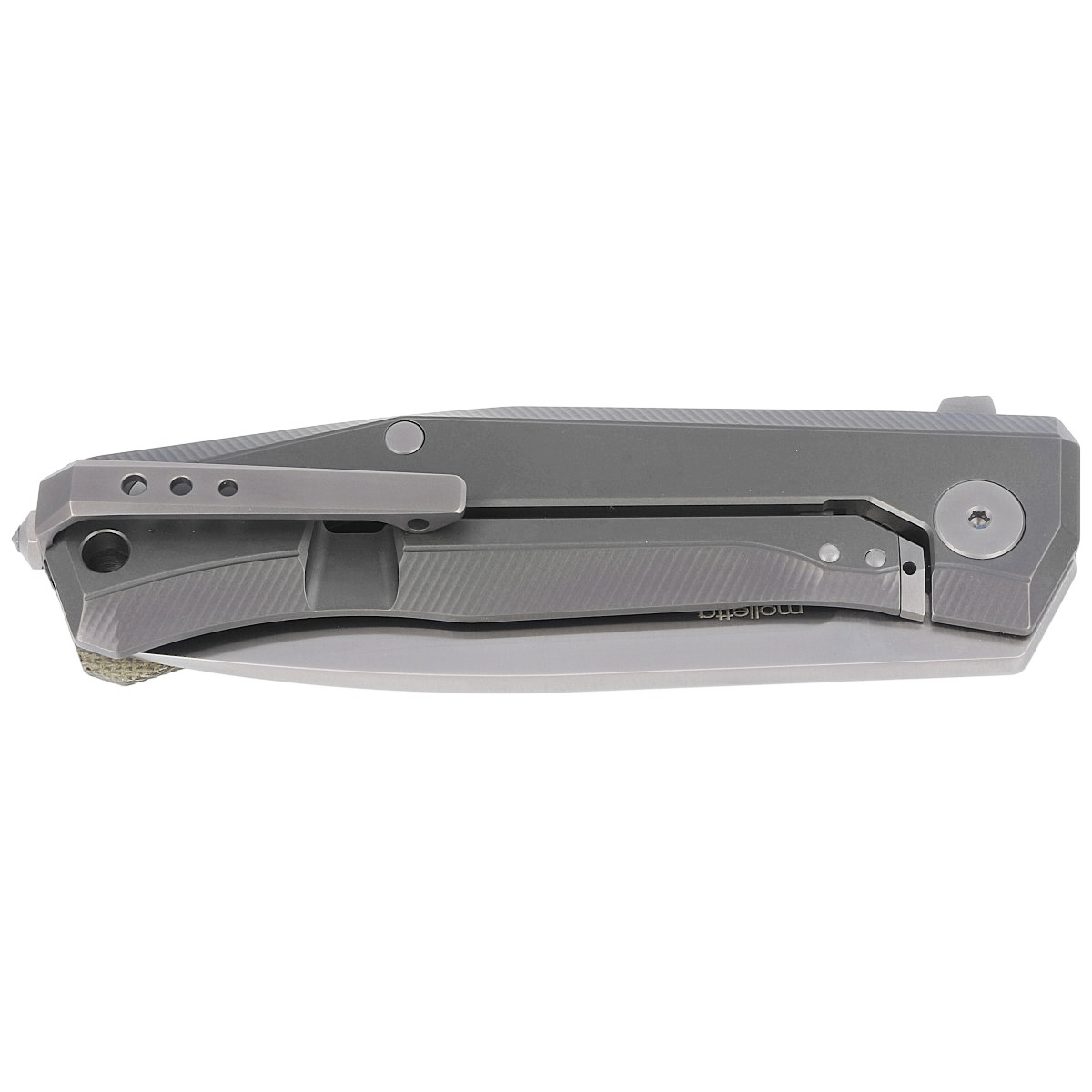 - Myto, Green Micarta, Satin Hi-Tech folder with durable frame-lock. Exceptional EDC knife, M390 steel blade, ReF blade located on the underside of the blade, Double Crown ball bearing system, titanium clip, Hand HY 68 key.