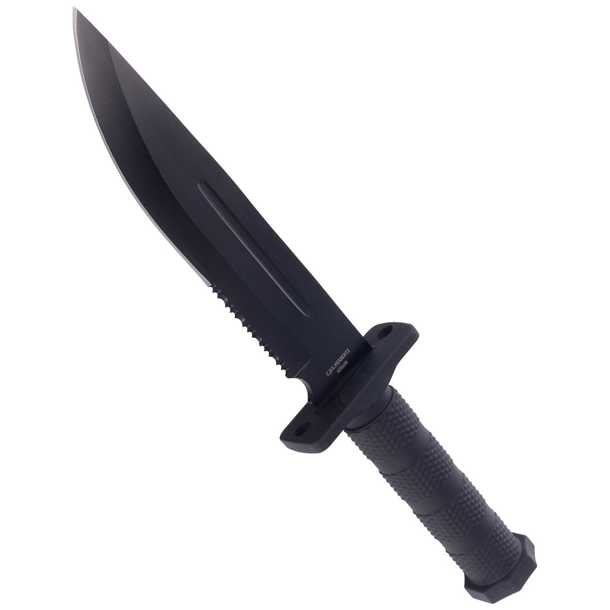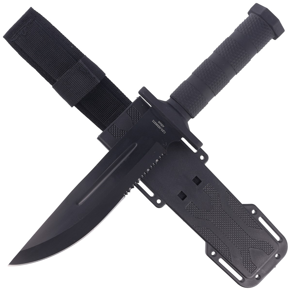 • Herbertz Bowie, Black Coated is a great companion for outdoor use. AISI 420 stainless steel blade with combo blade, full-length handle, hard plastic sheath, Belt and thigh attachment.