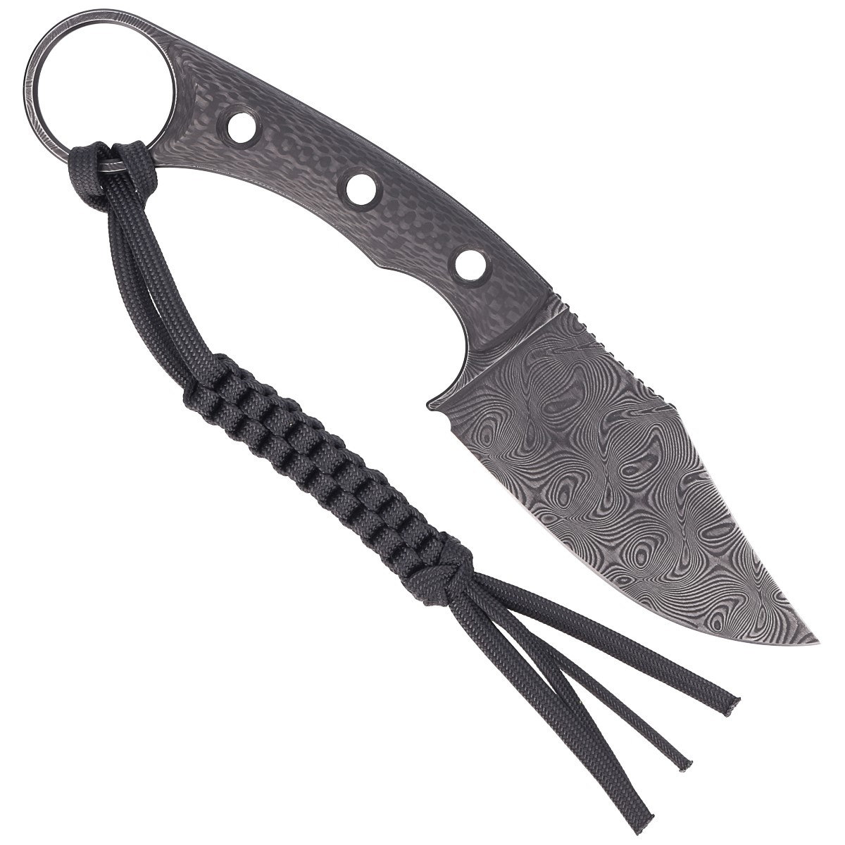 Midwatch Carbon Fiber, Damascus, a small EDC knife with a fixed blade. A thoroughly utilitarian blade shape made of Damascus, carbon fiber handle. Kydex sheath, equipped with a T-Clip to allow attachment to a belt, decorative paracord pendant.