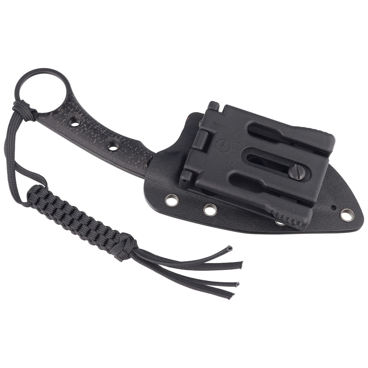 Midwatch Black Micarta, Black Stonewashed, a small EDC knife with a fixed blade. The thoroughly utilitarian shape of the blade made of N690 steel, handle made of jute micarta, sheath made of kydex, equipped with a T-Clip allowing attachment to the belt, decorative pendant made of paracord.