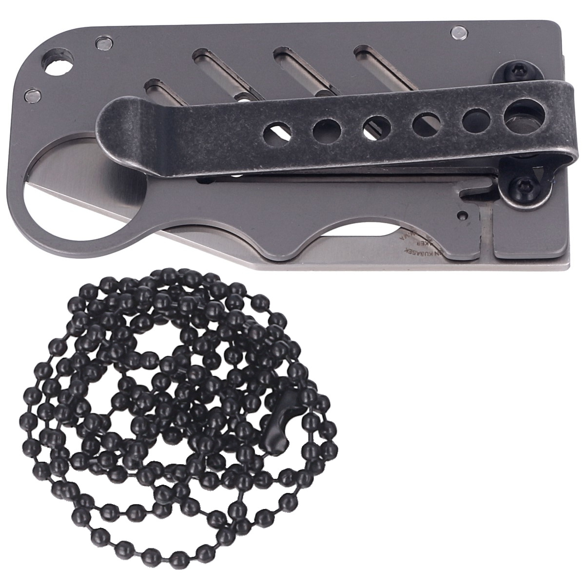 Handle - in the form of a titanium plate modeled by its shape on a credit card. In the back part a small insert made of G10 securing the tip of the knife in the folded position In the set we get a chain for hanging the knife on the neck and a removable clip. This gives us as many as three options for carrying the knife, in a wallet without the clip, in a pocket with the clip, or around the neck with the chain.