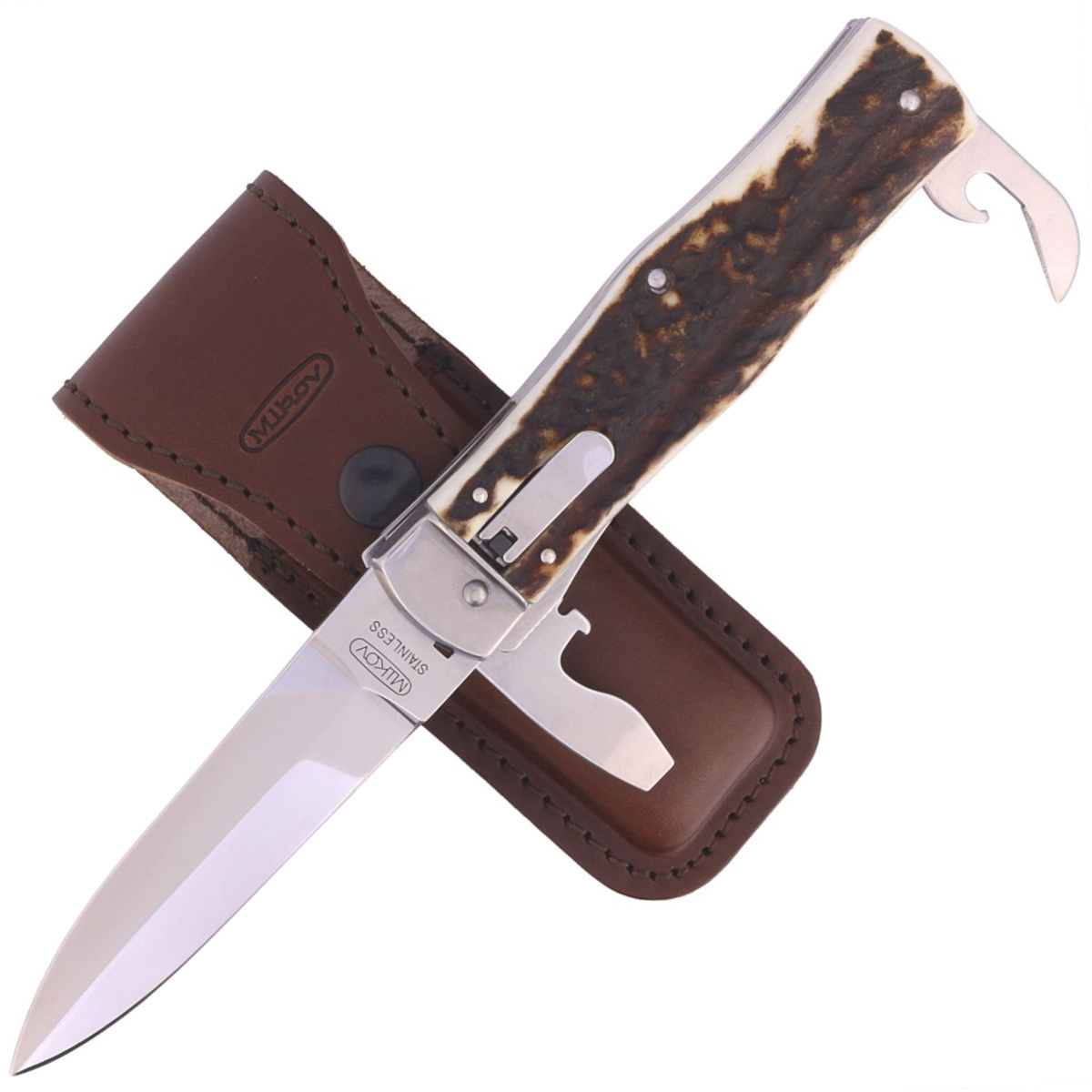 Predator Deer Stag, Mirror 3 blades, number of blades (3), number of tools (5). Automatic knife (switchblade) from the Czech company Mikov from Mikulasovice with three blades and deer stag linings. Mikulasovice is a region that has specialized in the production of knife products since 1794, being called the "Czech Solingen". The number of blades (3), the number of tools (5) makes the knife extremely functional.