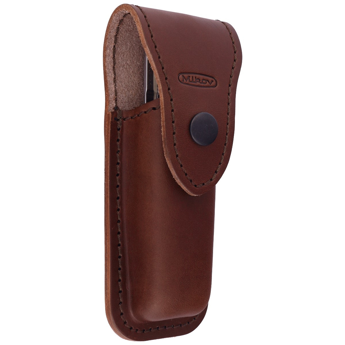 Case - fastened with a Prym type snap. Made of high quality natural leather in brown color with embossed manufacturer's logo. The leather sheath has an attachment to the belt or the equipment allowing to carry the knife in an upright position.