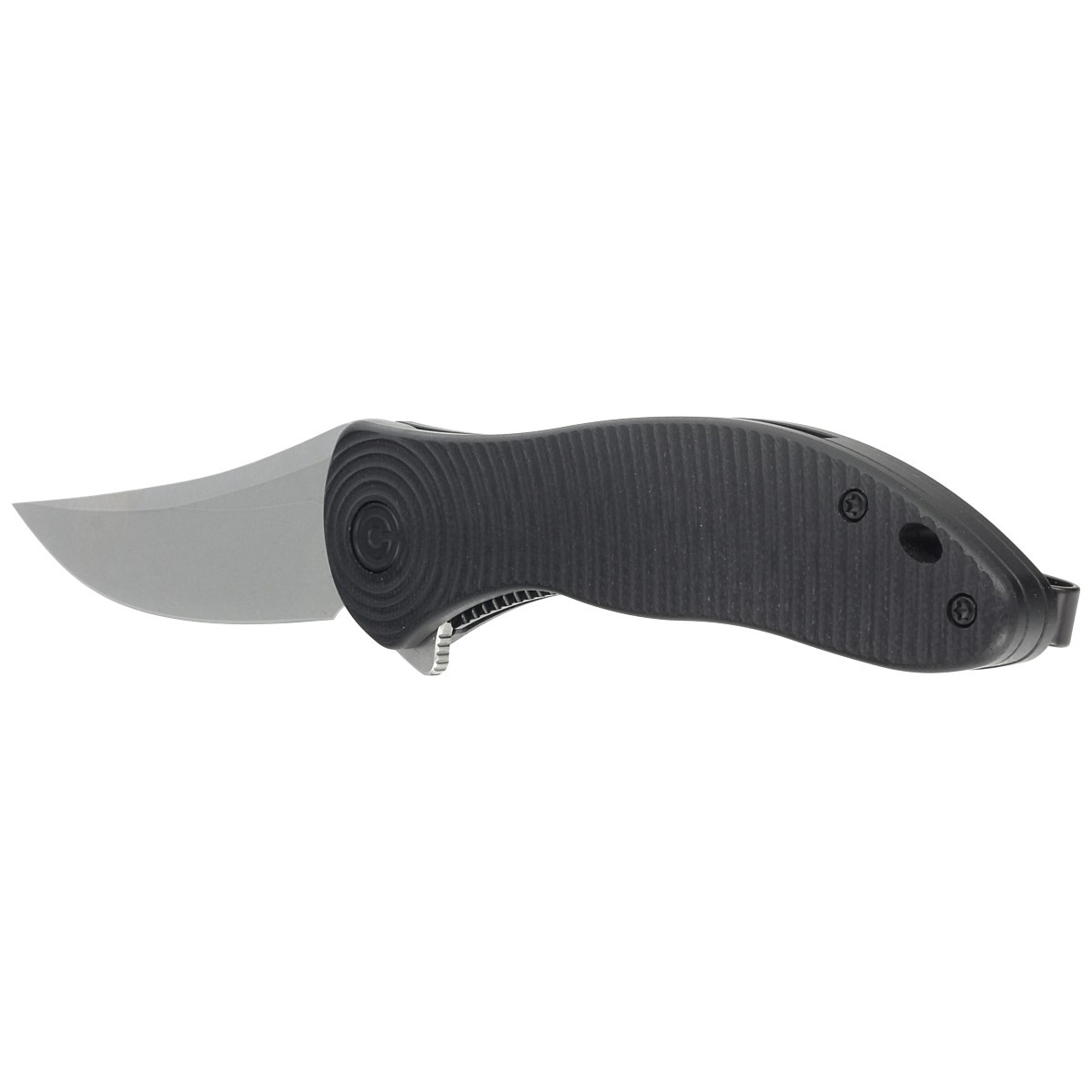 Handle - black G10, fiberglass facings pressed with resin, with a beautiful pattern of concentrically spreading circles. Chamfered edges of the covers eliminate sharp edges for comfort and improve grip confidence. The backspacer is made of the same material as the handle grips. The pivot is decorated with a stylized Civivi brand logo. A single-position, right-side deep carry clip allows you to carry the knife discreetly in your pocket in tip-up position (blade tip up).