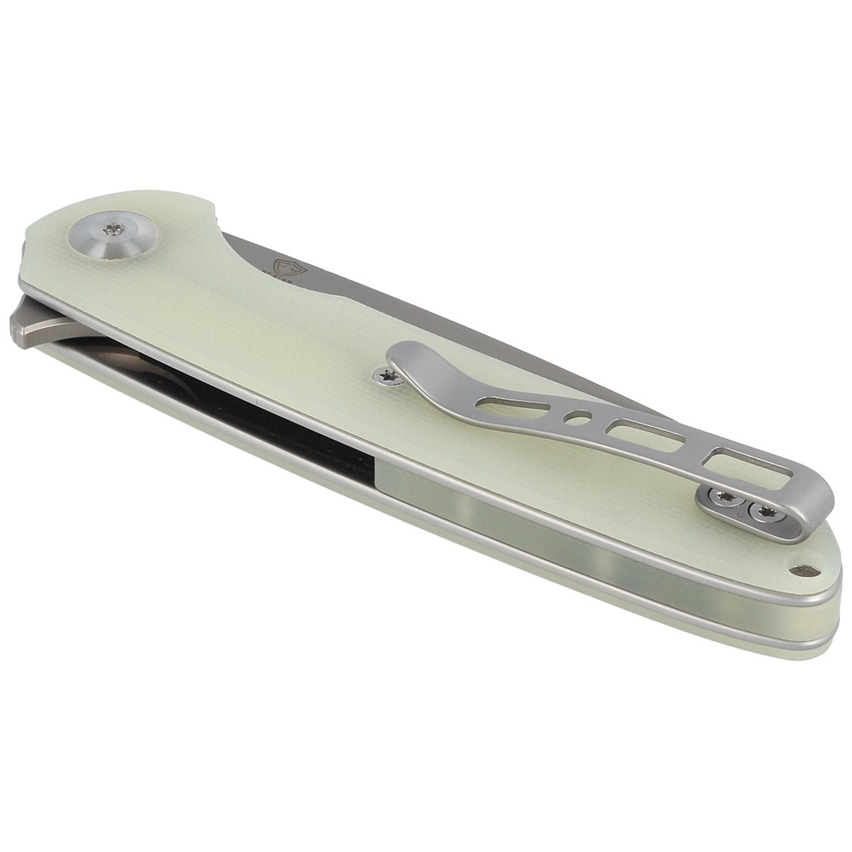 Handle - in natural color. Made of G10, a composite fiberglass material compressed under pressure with synthetic resin. Chamfered cover edges eliminate sharp edges for comfort, grip. Backspacer made of the same material as the covers. Fore finger groove made on the front improves grip security. Two-position, right/left deep carry clip allows you to carry the knife discreetly in your pocket in tip-up position (tip of the blade upward).