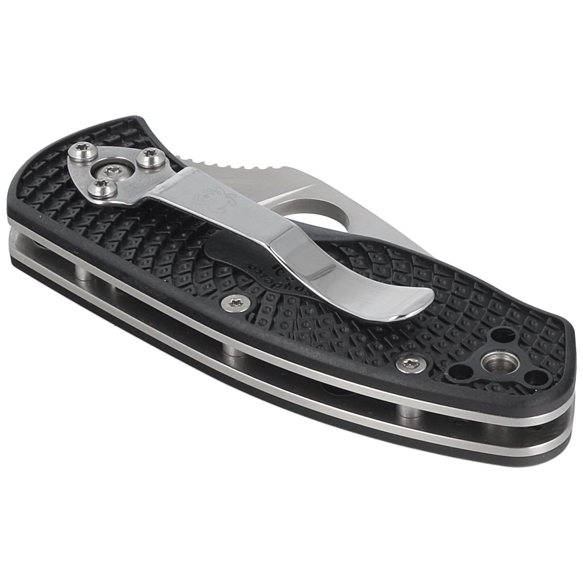 Blade - with a wide curved Leaf Shaped profile, 3.1 mm thick provides excellent cutting edge geometry with low friction. The cutting edge is derived with a Full Flat Grind. The Plain Smooth blade extends along the entire length of the blade for powerful cuts. The blade is made of well-sharpened 8Cr13MoV stainless steel (equivalent to Japanese AUS-8 steel) finished with an elegant Satin finish. Careful placement on the blade of the enlarged 14mm circular SpyderHole cutout (Spyderco patent) positions the hand for intuitive opening of the blade and at the same time increases the hump of spine jimping thumb support. The blade locks with a Liner-Lock, Michael Walker jimped liner.