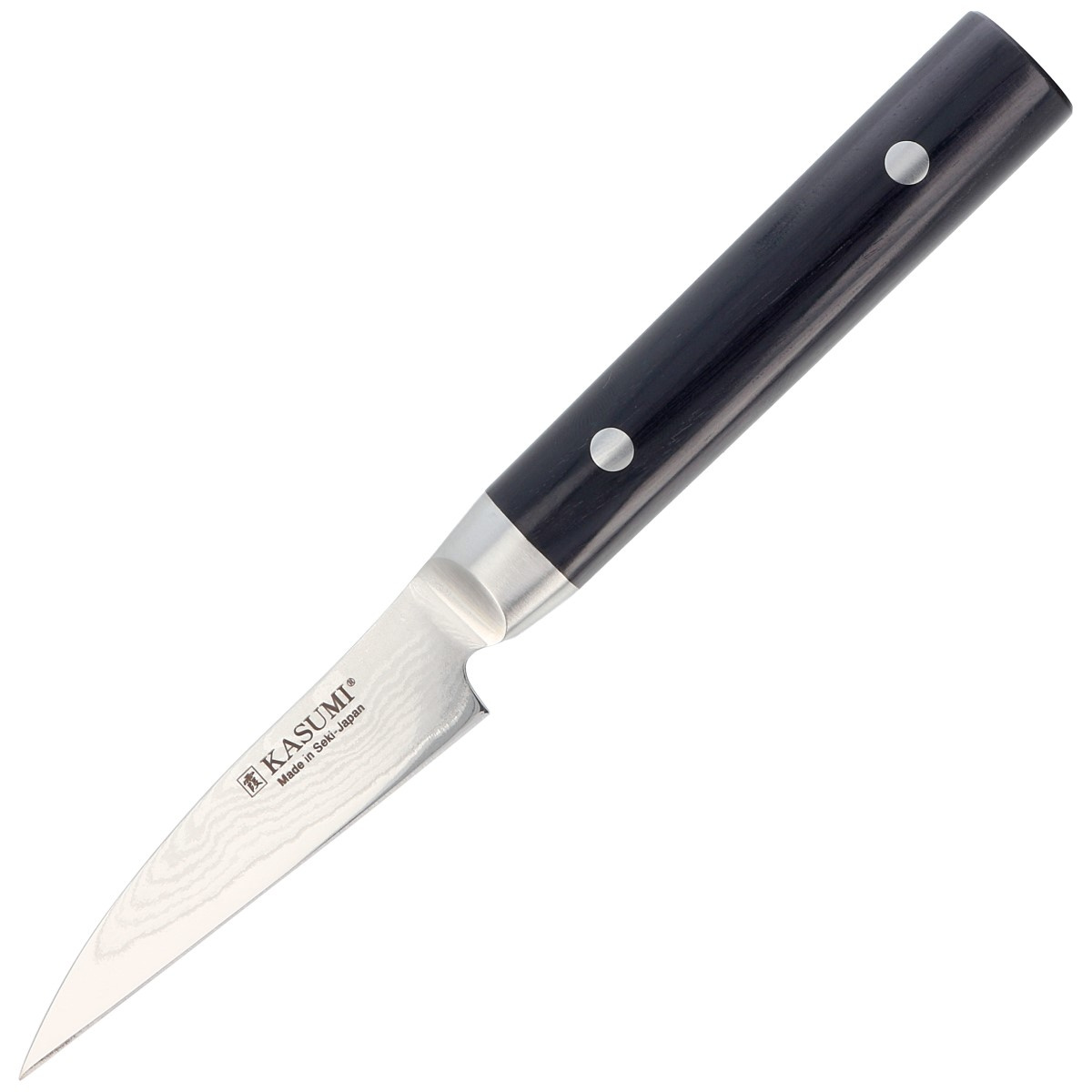 Kasumi Damascus Paring with VG-10 stainless steel core finished with 32 ply damascus. Made using the same methods as samurai swords, with a comfortable European pakka wood handle. Note!!! Very sharp!!! In 2002, "KASUMI" knives won the Design Plus Award at Ambiente Messe in Germany.