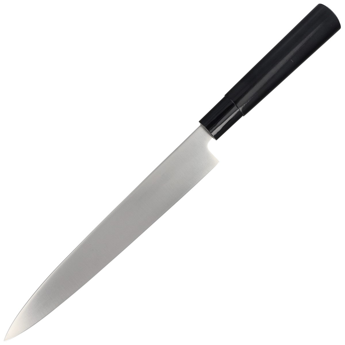 Kasumi Tora Sashimi 24 in Molybdenum Vanadium Stainless Steel. Made using the same methods as samurai swords, with a comfortable round handle made of magnolia wood laminated with black epoxy. Note!!! Very sharp!!! In 2002, "KASUMI" knives won the Design Plus Award at Ambiente Messe in Germany.