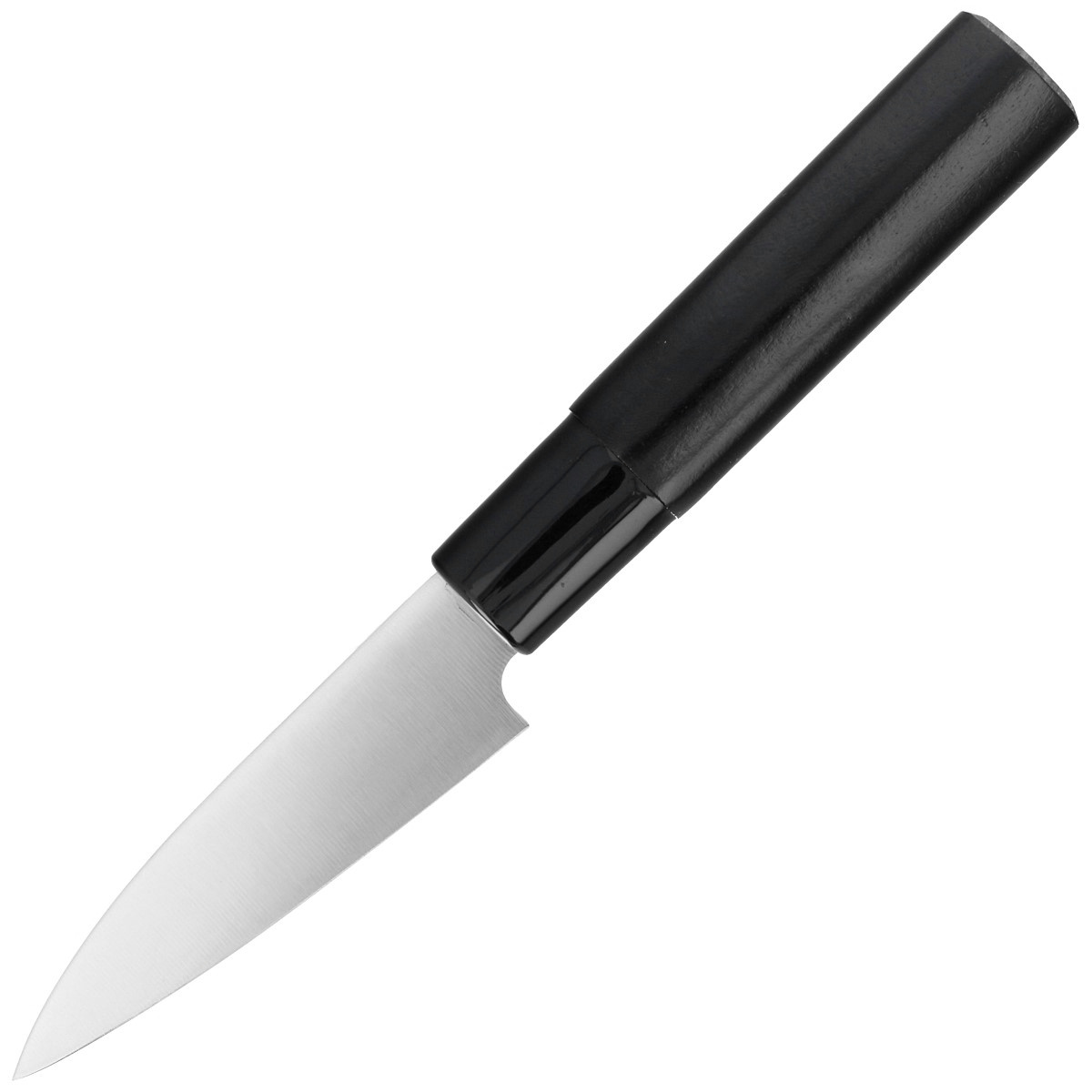 Kasumi Tora Paring in Molybdenum Vanadium Stainless Steel. Made using the same methods as samurai swords, with a comfortable round handle made of magnolia wood laminated with black epoxy. Note!!! Very sharp!!! In 2002, "KASUMI" knives won the Design Plus Award at Ambiente Messe in Germany.