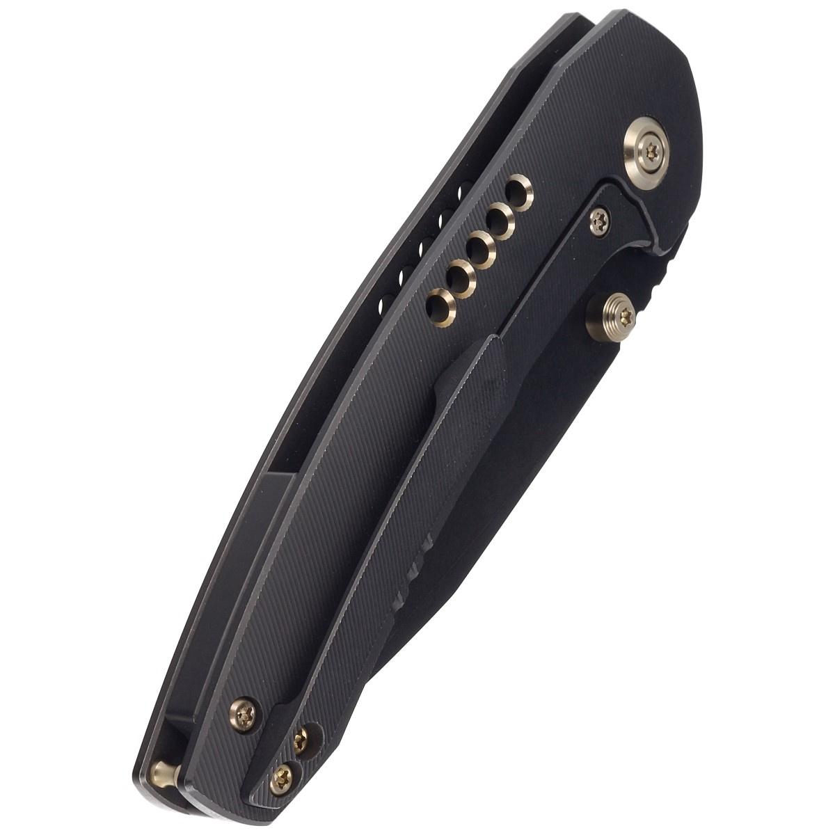 Handle - thick pieces of titanium, joined together by a titanium backspacer. The surface texture made on CNC machine tools improves the certainty of the grip. The simplicity and solidity of the design give confidence in many years of use. The single-position clip (right), made of titanium, allows the knife to be carried in tip-up position. The backspacer has a place for threading a safety or decorative cord. As in other models, the pivot axis is decorated with a stylized manufacturer's logo.