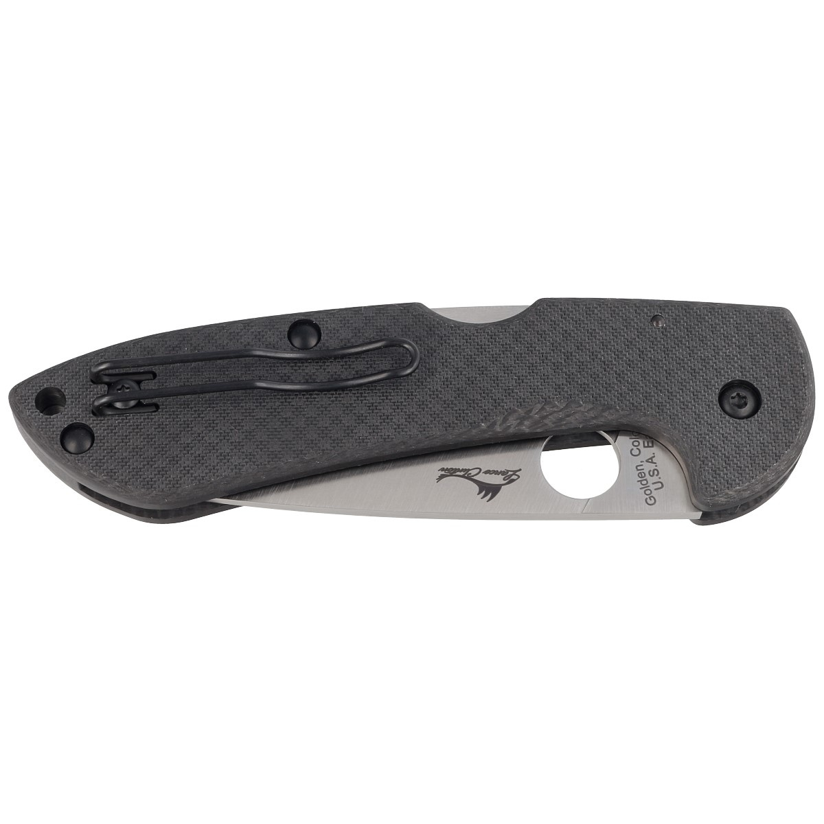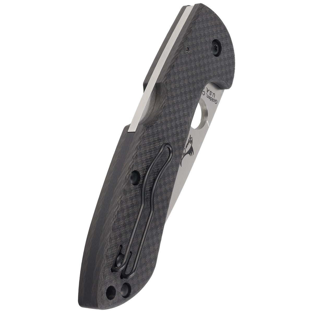 Blade - a slim and sharp Drop Point with a smooth Plain blade with an elegant satin finish on the blade. Completely flat grind (Full Flat Grind), provides exceptional edge geometry. Enlarged 14mm SpyderHole cutout (Spyderco patent) for ambidextrous thumb opening. Deep index-finger choil, index finger undercut for control of the folder grip and also to protect the finger from slipping on the blade.