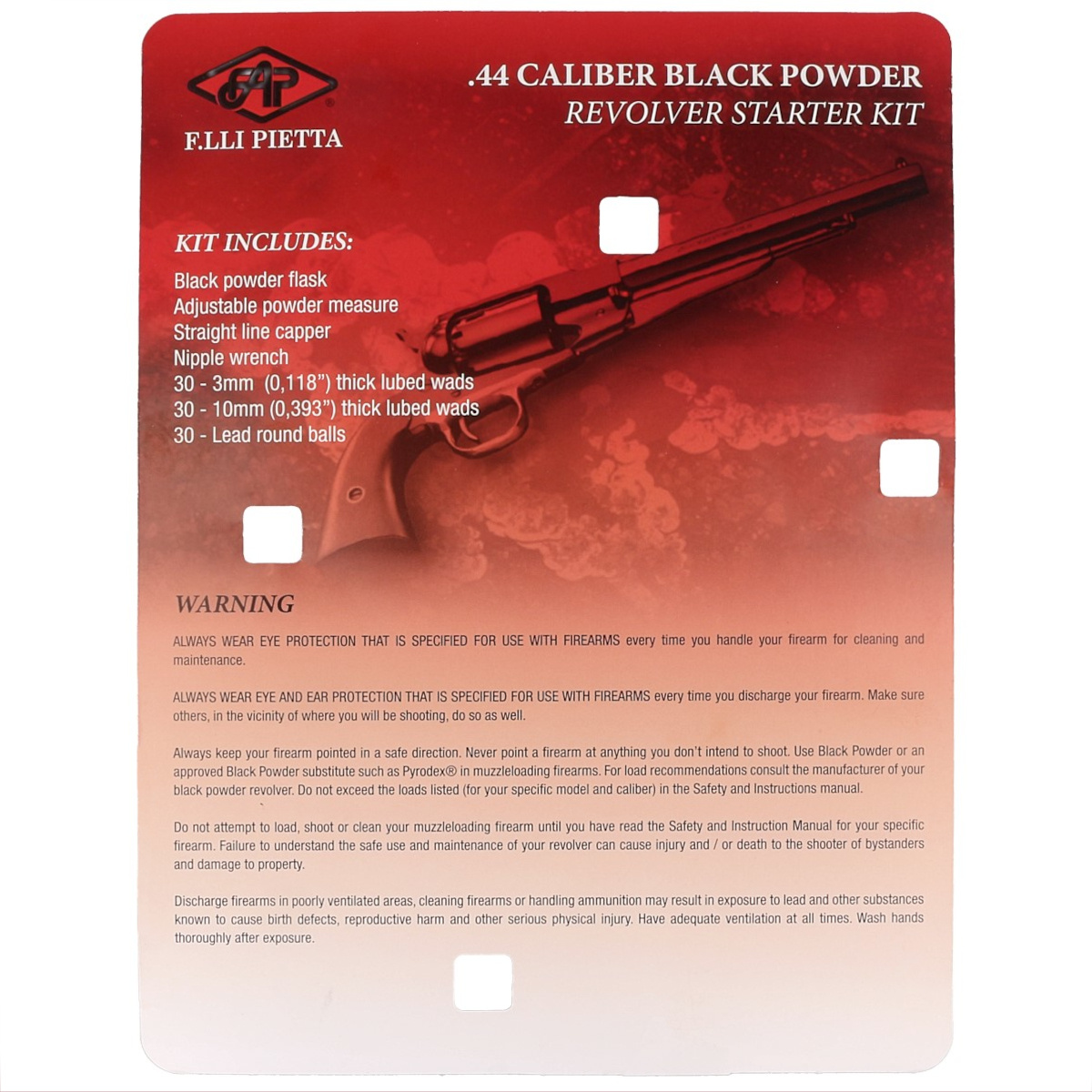 - Pietta starter kit for black-powered revolver in caliber .44. Comes complete with powder magazine, measuring cup, capstick, 3mm and 10mm felt nails, lead bullets, fireplace wrench.