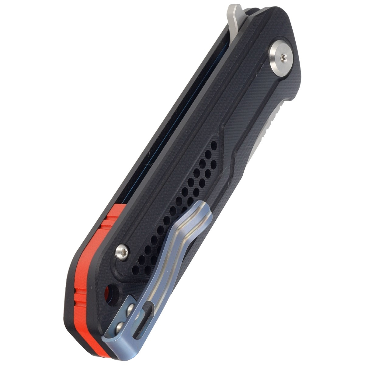 Handle - G10 liners, a plastic that is insensitive to weather conditions, resistant to chemicals and mechanical damage Chamfered edges of the covers eliminate sharp edges and textured surfaces improve grip security. A series of holes in the liner relieves stress on the knife. The solid backspacer to which the facings are attached guarantees the rigidity and strength of the entire structure. A single-position, right-handed titanium clip allows the knife to be carried in tip-up position, with the tip of the blade upward. Above the clip a hole for threading a safety or decorative cord.