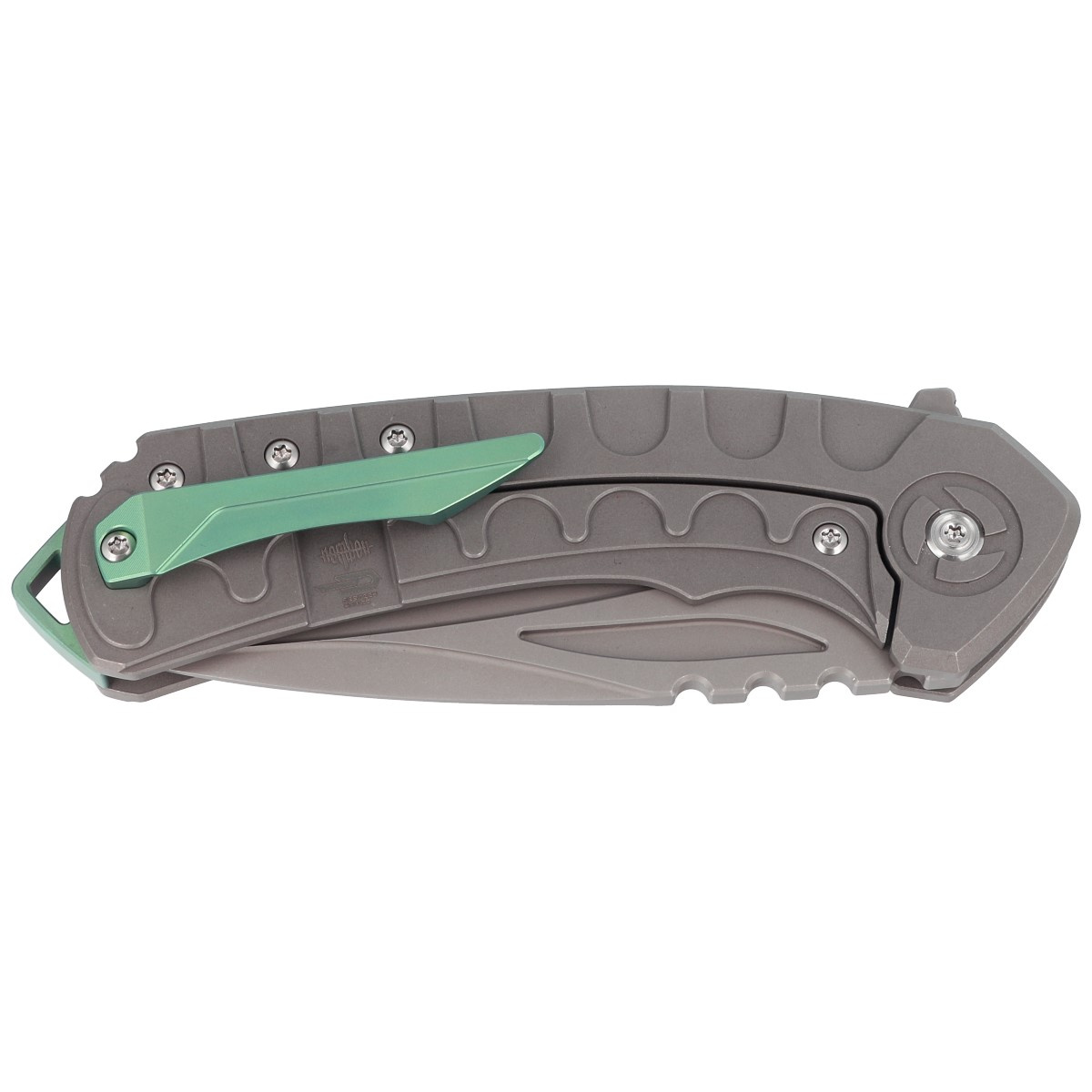 Handle - is two pieces of grey solid titanium 6AL4V. Chamfered edges of the covers eliminate sharp edges for comfort and improve grip security, additional decoration in the shape of crocodile scales. The solid backspacer to which the facings are attached guarantees the rigidity and strength of the entire structure. A single-position, right-handed titanium clip allows the knife to be carried in tip-up position, with the tip of the blade upward. The protruding part of the backspacer creates a hole for threading a belaying or decorative cord, and can also be used as a glass breaker.