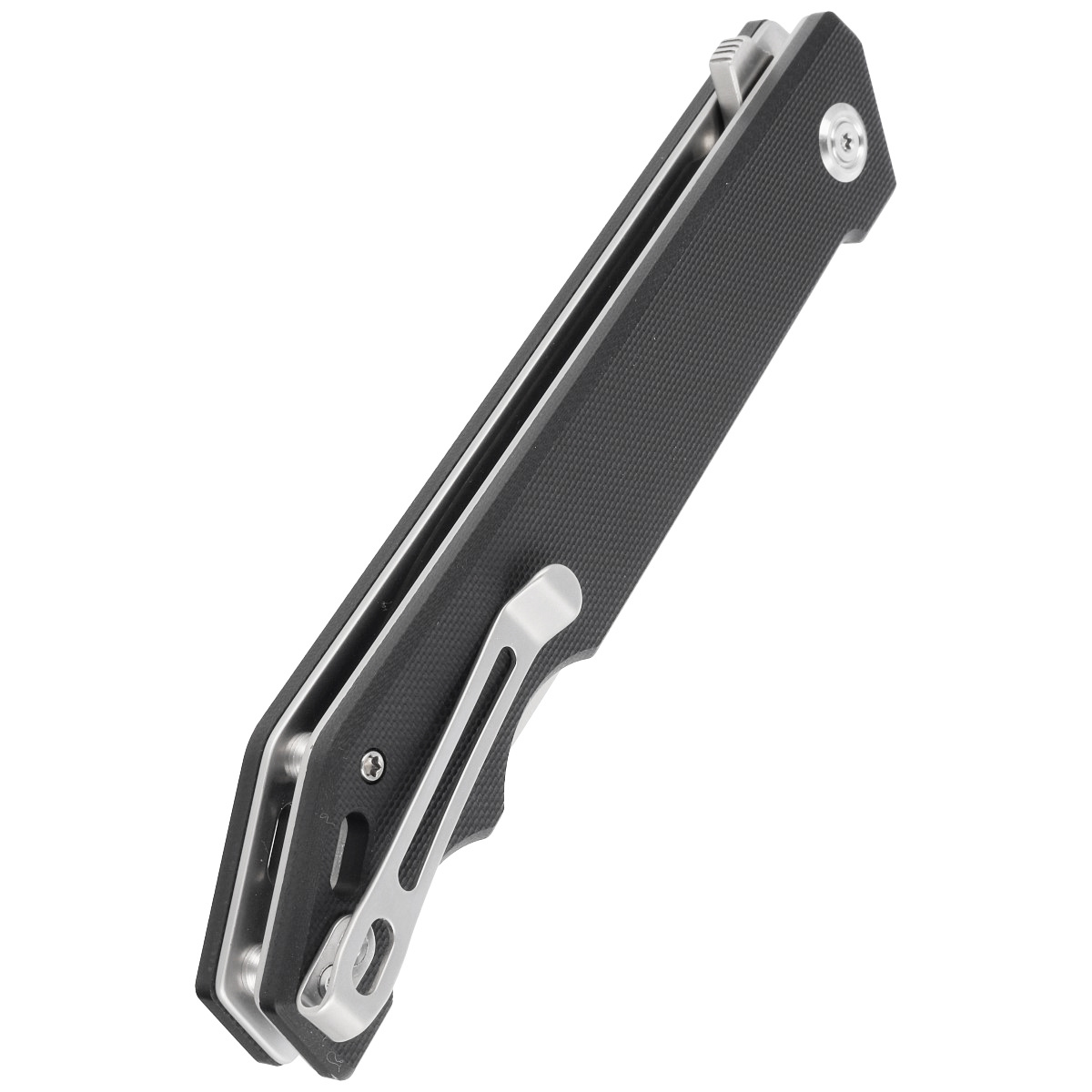 Handle - grips made of G10 (pressure-pressed fiberglass with synthetic resin), textured to improve grip confidence, bolted to the knife's steel frame. The so-called open-backed design without the typical backspacer, fastened together with steel spacers for easy cleaning. The simple, sturdy design gives assurance of many years of use. In the backspacer, two ergonomic finger recesses make it easier to grip the tip of the Handle, which increases power when chopping. Pivot decorated with a stylized manufacturer's logo. Two-position (right/left) steel deep-carry clip allows you to carry the knife discreetly in your pocket in tip-up position (blade tip up).
