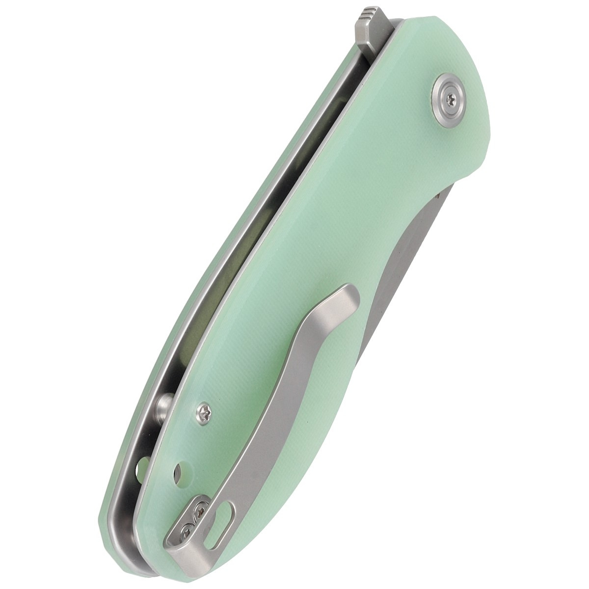 Handle - G10 (pressure-pressed fiberglass with synthetic resin) facings. Textured to improve grip confidence, bolted to the knife's steel frame. The so-called open-backed design without the typical backspacer, fastened together with steel spacers for easy cleaning. The simple, sturdy design gives assurance of many years of use. Two-position (right/left) steel deep-carry clip allows you to carry the knife discreetly in your pocket in tip-up position (blade tip up). Above the clip a lanyard hole, a hole for threading a safety or decorative cord.