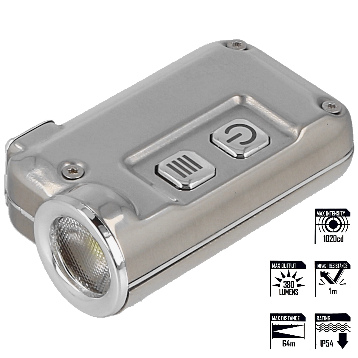 Nitecore TINI SS small, waterproof flashlight, key ring provides a high quality light source. Compact design, four modes Turbo 380 lm, High 145 lm, Mid 38 lm and Low 1.0 lm, an ideal E.D.C. flashlight.