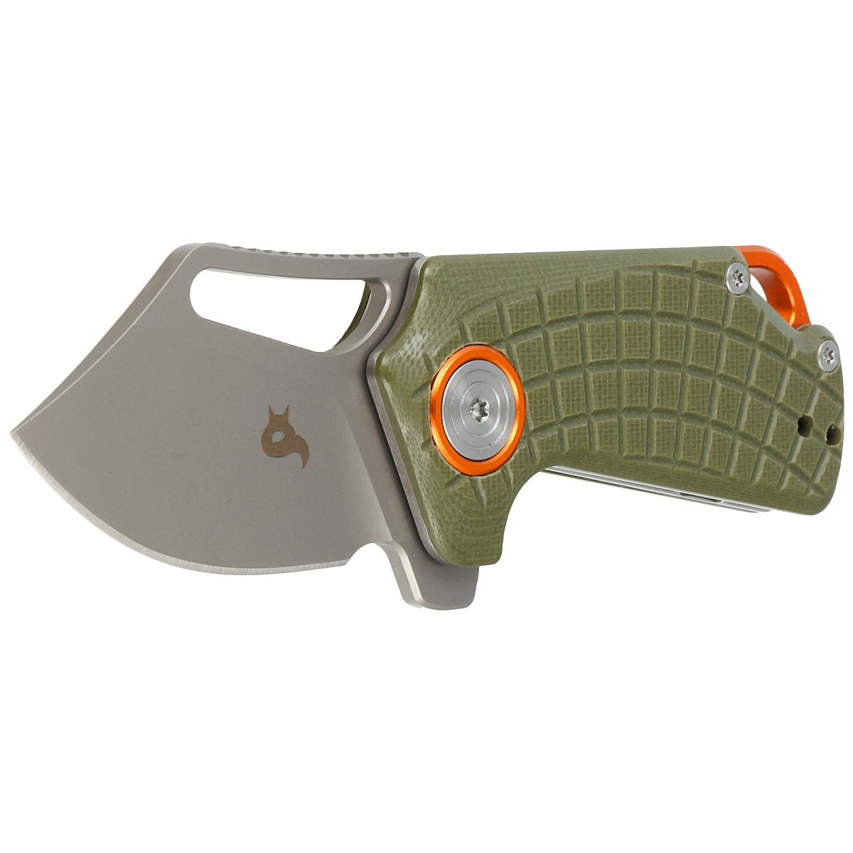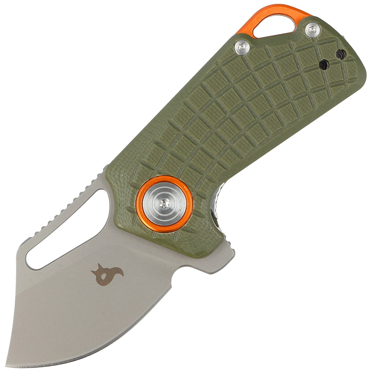 Handle - green G10 (pressure-pressed fiberglass with synthetic resin) facings, textured to improve grip confidence, are bolted to the knife's steel frame. The whole is stiffened by a solid steel backspacer. The simple, sturdy design gives you the assurance of many years of use. A deep finger undercut (fore finger groove) improves grip security. The pivot axis is decorated with a decorative orange circle. A two-position (right/left) metal deep-carry clip allows you to carry the knife discreetly in your pocket in tip-up position (blade tip up). Above the clip a lanyard hole, a hole for threading a safety or decorative cord.