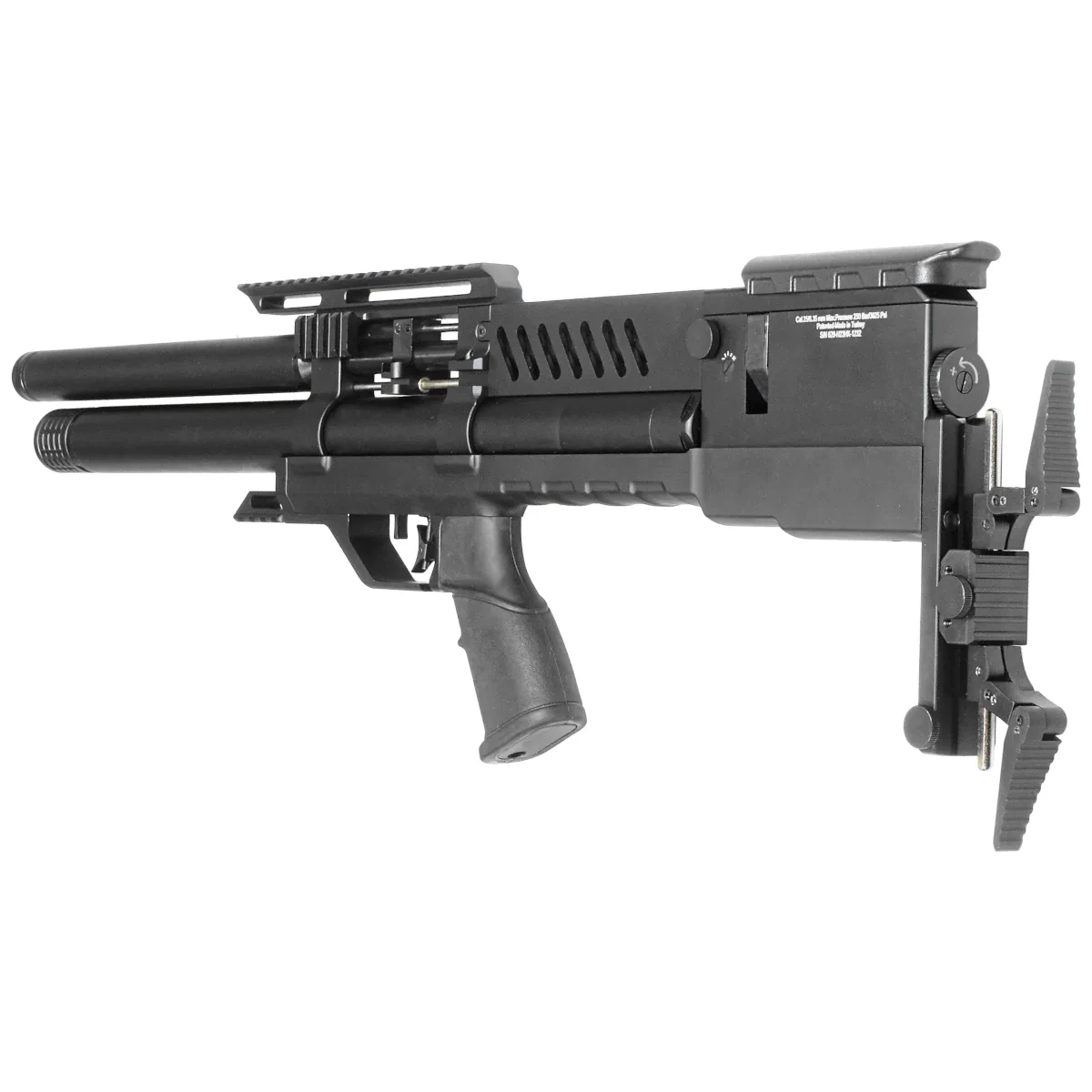 Reximex Meta, modern PCP air rifle in the version known for its offset chamber and magazine behind the trigger bullpup. By using a cradleless, obtained compact dimensions of the rifle, while maintaining the normal length of the barrel to guarantee accuracy and range, as well as the weight reduction typical of this design for better control. The air rifle is equipped with lever tensioning Side Lever, shot power regulator, adjustable in 3 planes footer, monopod and a barrel with an integrated sound suppressor. Available in calibers: .177 (4.5 mm), .22 (5.5 mm), .25 (6.35 mm).
