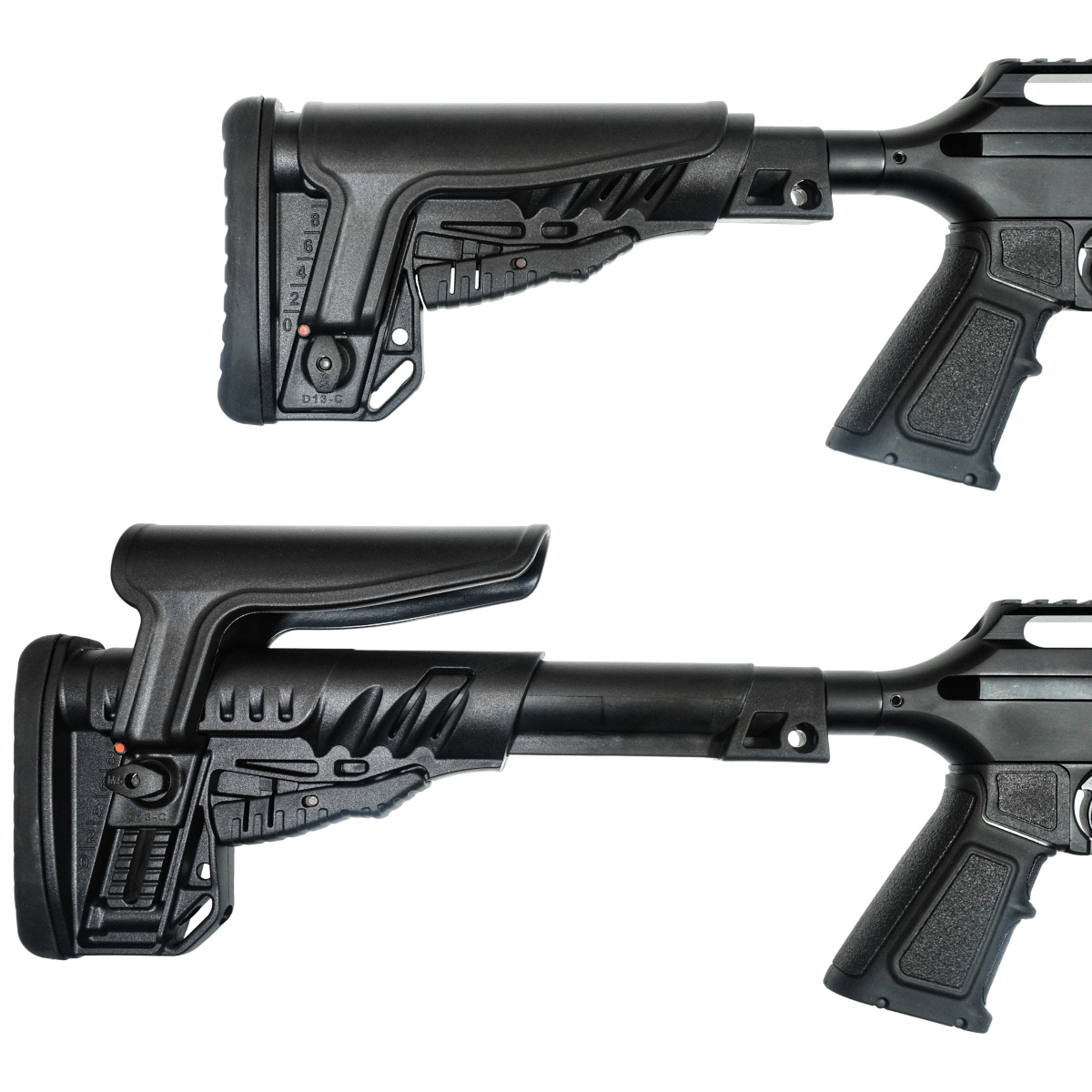 Settlement - type tactical with ergonomic pistol grip, making it easier to hold the weapon steady while shooting. Made of durable polymer in color black. Telescopic kolba z adjustable cheekpiece completed rubber foot.