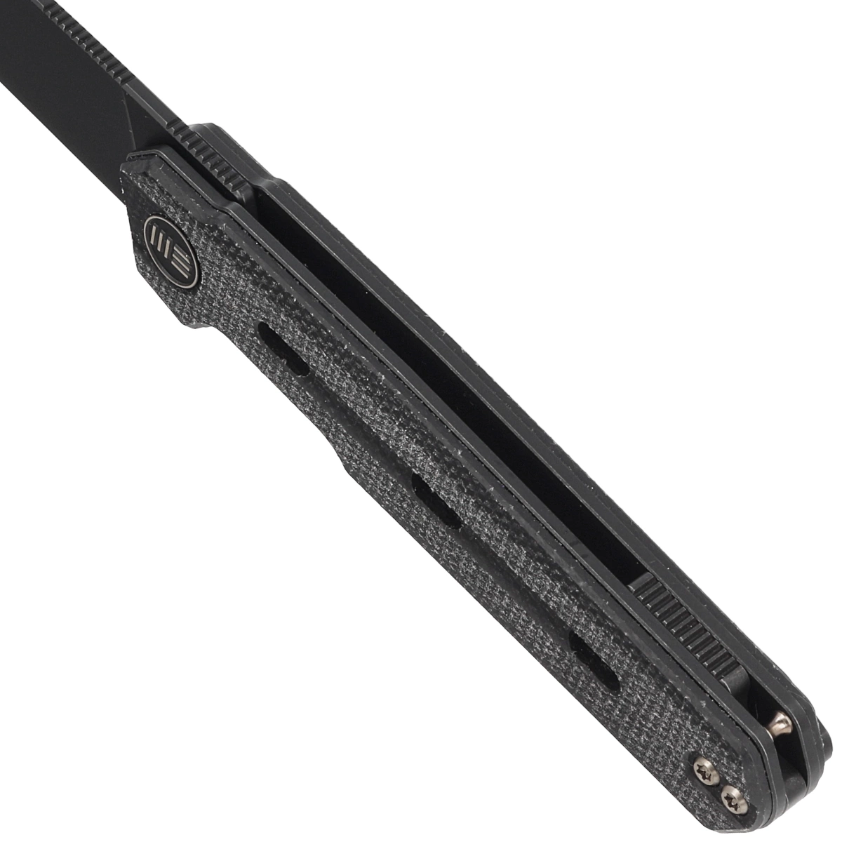 Handle - Canvas Micarta (pressure-pressed canvas with synthetic resin) attached to 6AL4V titanium liners. Chamfered edges of the liners eliminate sharp edges. The grips are screwed to an intricately machined titanium backspacer, giving assurance of many years of use. The pivot axis is decorated with a stylized WE Knife brand logo. A two-position (right/left) titanium deep-carry clip allows you to carry the knife discreetly in your pocket in the tip-up (blade tip up) position. On the back of the Handle a lanyard hole, hidden in the backspacer, a place for a decorative or safety line.