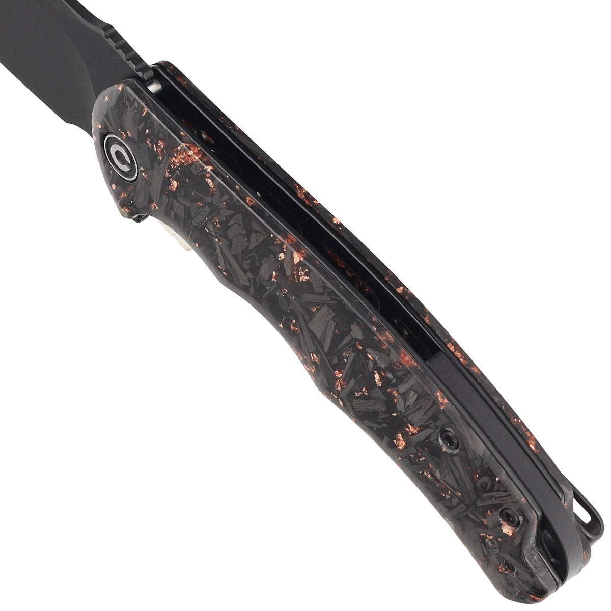 Handle - grips with a unique 3D pattern. Made of pieces of shredded carbon fiber (Carbon Fiber) and copper flakes embedded in transparent resin. The whole was screwed to a steel knife frame. Chamfered edges of the sheaths eliminate sharp edges, and fore finger grooves made on the front improve grip security. In practice, this means many years of use without weakening the design. A two-position deep-carry clip for right- and left-handers allows the knife to be carried in tip-up position (with the tip of the blade up). Above the clip a lanyard hole, an enlarged hole for a safety cable.