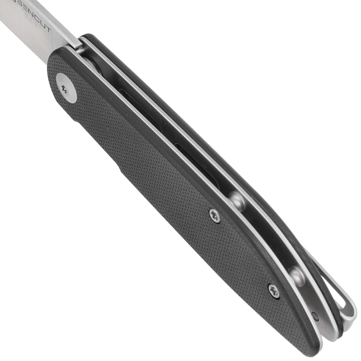 Handle - made of G10, a composite fiberglass material compressed with synthetic resin. The chamfered edges of the covers eliminate sharp edges for comfort, and the jimping made at the front on the liners improves grip security. An open-backed design fixed with steel spacer sleeves reduces weight and facilitates cleaning. A single-position (right) deep-carry clip allows you to carry the knife discreetly in your pocket in tip-up position (tip of the blade upward).