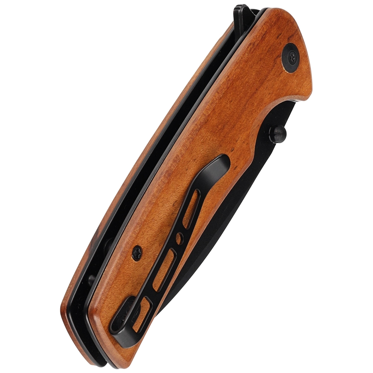 Handle - screwed to steel liners, grips made of exotic Guibourtia wood with a unique grain pattern (Latin name for Bubinga wood) provide an exclusive look. Chamfered edges of the covers for improved ergonomics, and jimping made on the front on the liners improves grip security. Open-backed design fixed with steel spacer sleeves reduces weight and facilitates cleaning. A two-position right/left deep carry clip allows you to carry the knife discreetly in your pocket in tip-up position (tip of the blade upward).