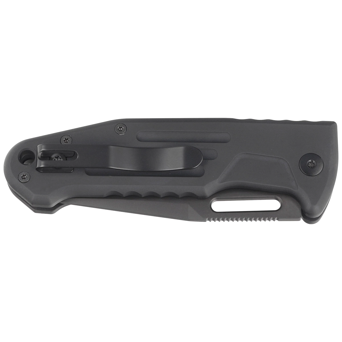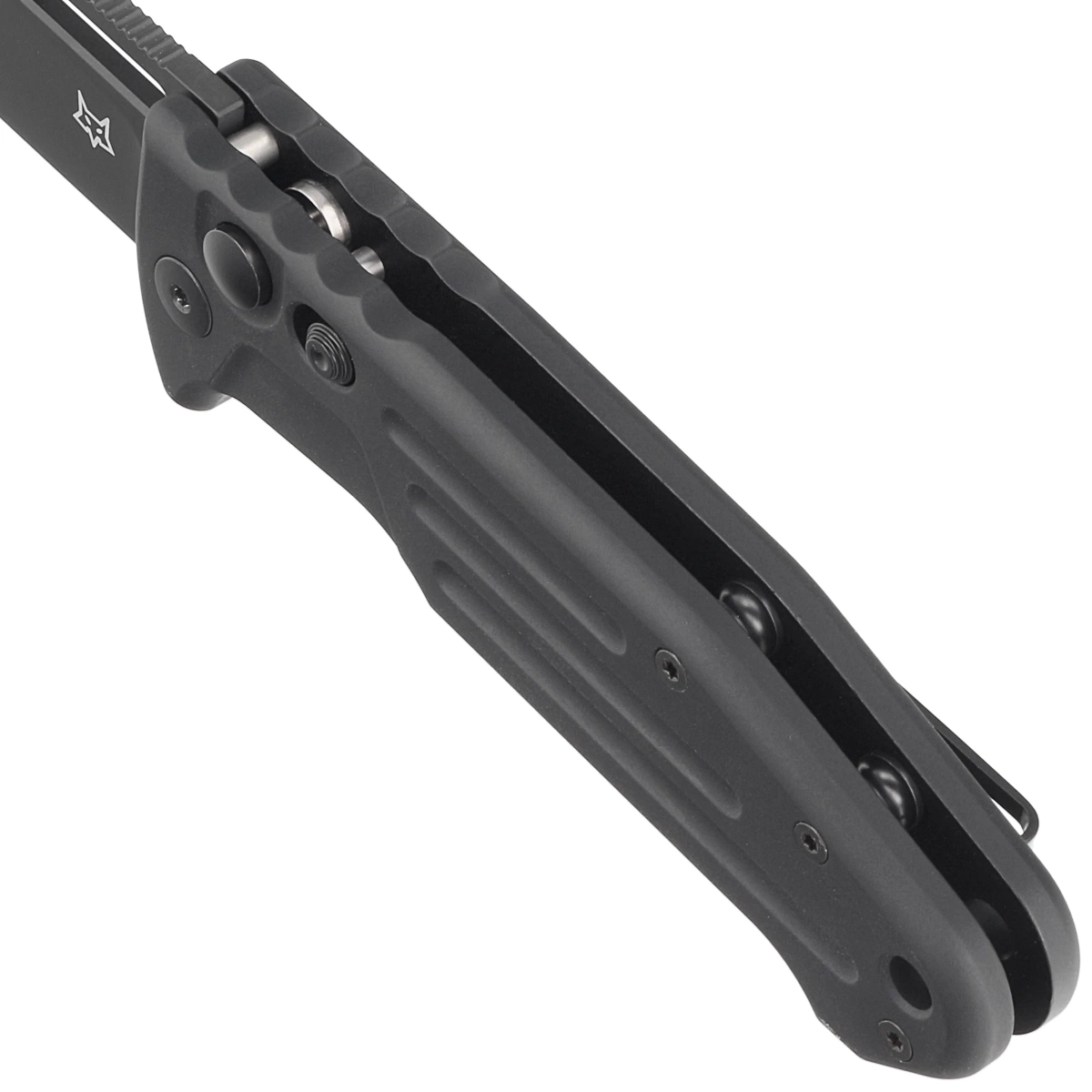 Handle - in black. Made of textured aluminum, whose beveled edges of the covers eliminate sharp edges for comfort, and the fore finger groove made on the front improves grip security. Next to the opening button is a locking slider, allowing you to block the possibility of accidental opening. A single-position (right) deep-carry clip allows you to carry the knife discreetly in your pocket in tip-up position (blade tip up).