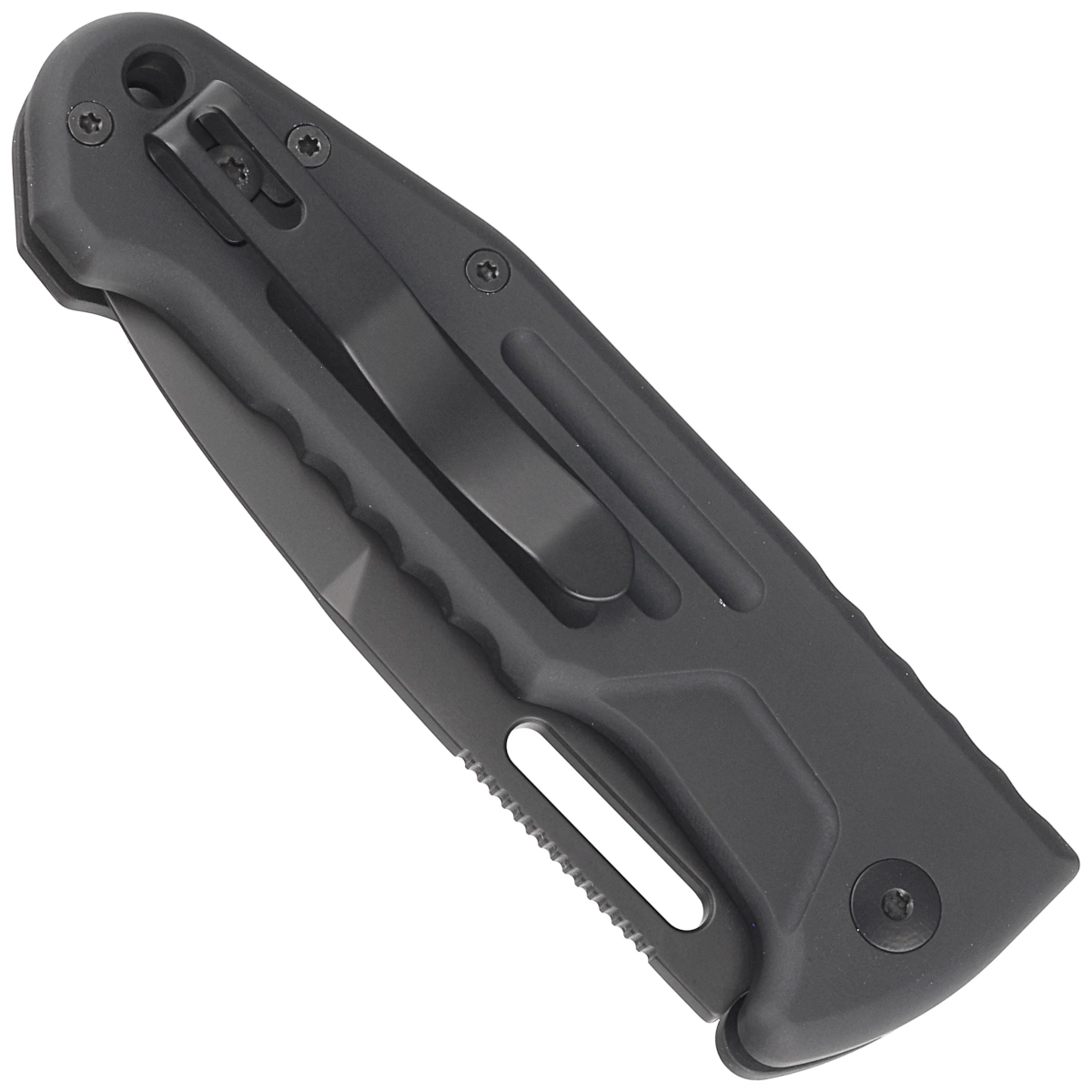 Handle - in black. Made of textured aluminum, whose beveled edges of the covers eliminate sharp edges for comfort, and the fore finger groove made on the front improves grip security. Next to the opening button is a locking slider, allowing you to block the possibility of accidental opening. A single-position (right) deep-carry clip allows you to carry the knife discreetly in your pocket in tip-up position (blade tip up).