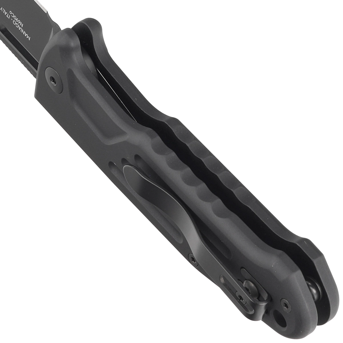 New Smarty Spear Point Black Anodized Aluminum, Black PVD is a automatic knife (Switchblade) designed by Stefano De Lorenzi. Featuring an extremely durable construction, equipped with a robust lock that turns the folder into a fixed-blade knife. Made with N690Co stainless steel and a strong aluminum handle. Bestseller!