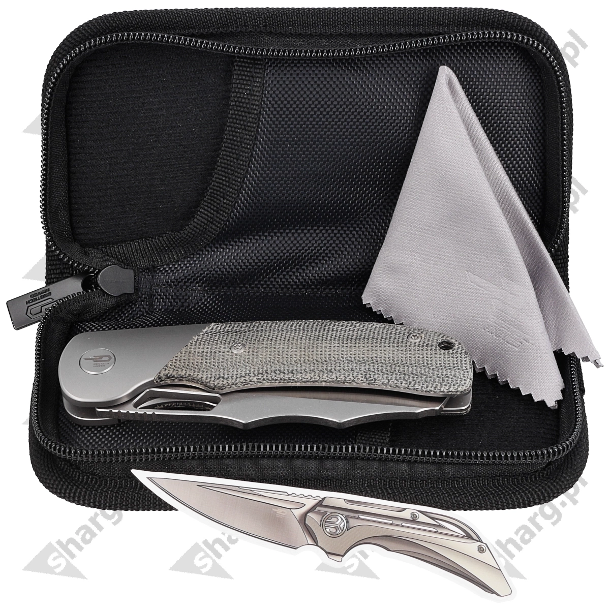 Handle - grips made of Canvas Micarta, a virtually indestructible plastic that is insensitive to weather conditions, resistant to chemicals and mechanical damage, and titanium bolsters. The titanium backspacer to which the grips are attached guarantees the rigidity and strength of the entire structure. A single-position, right-handed titanium clip allows the knife to be carried in the tip-up position, with the tip of the blade upward. Above the clip a hole for threading a safety or decorative cord.