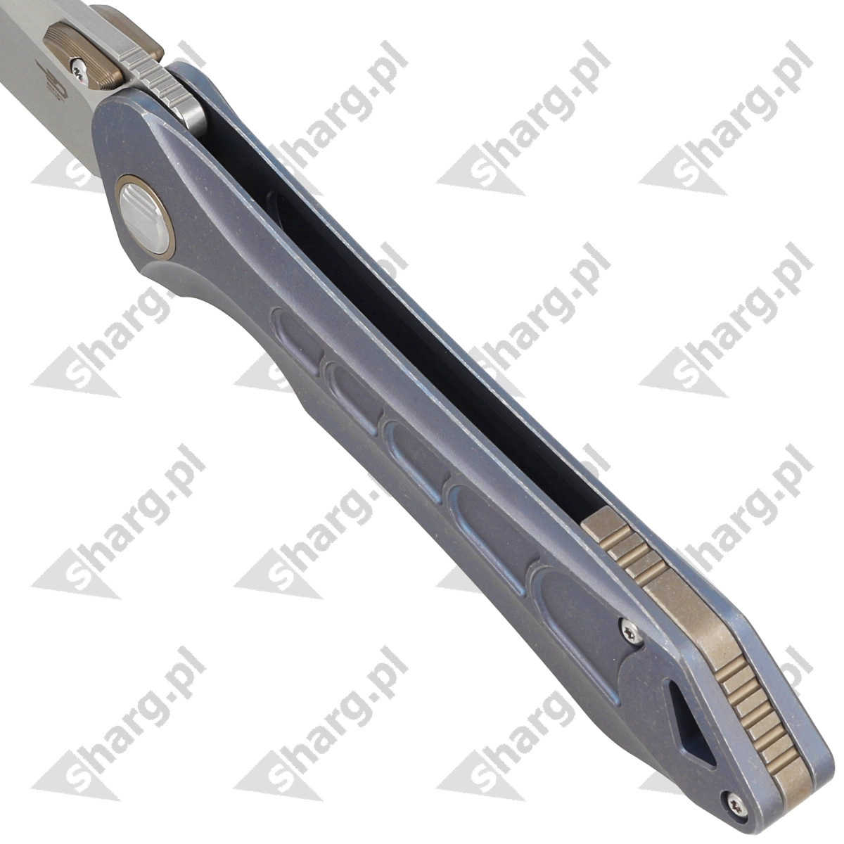 Handle - 6AL4V titanium grips dyed blue. The titanium backspacer to which the grips are attached guarantees the rigidity and strength of the entire structure. The single-position, right-handed clip allows the knife to be carried in tip-up position, with the tip of the blade upward. Above the clip a hole for threading a safety or decorative cord. The clip, backspacer and decorative ring around the pivot (collar ring) finished in bronze, beautifully contrasting with the blue grips.