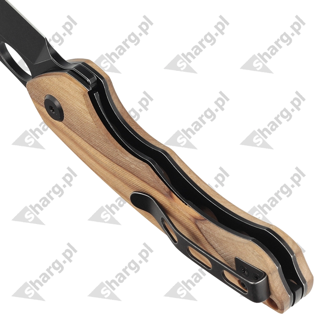 Handle - olive wood grips with a unique pattern. The chamfered edges of the covers eliminate sharp edges and the textured surface improves grip confidence. Deep finger undercut (fore finger groove) improves ergonomics. The solid backspacer to which the grips are attached guarantees the rigidity and strength of the entire structure. A single-position, right-handed clip allows the knife to be carried in tip-up position, with the tip of the blade upward.