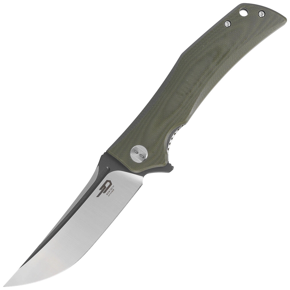 - Scimitar Olive G10, Gray / Satin, a handy EDC folder with a slightly exotic look. Made with characteristic Bestech care. On the Handle grips made of G10, Blade made of proven D2 tool steel, all at an excellent price.