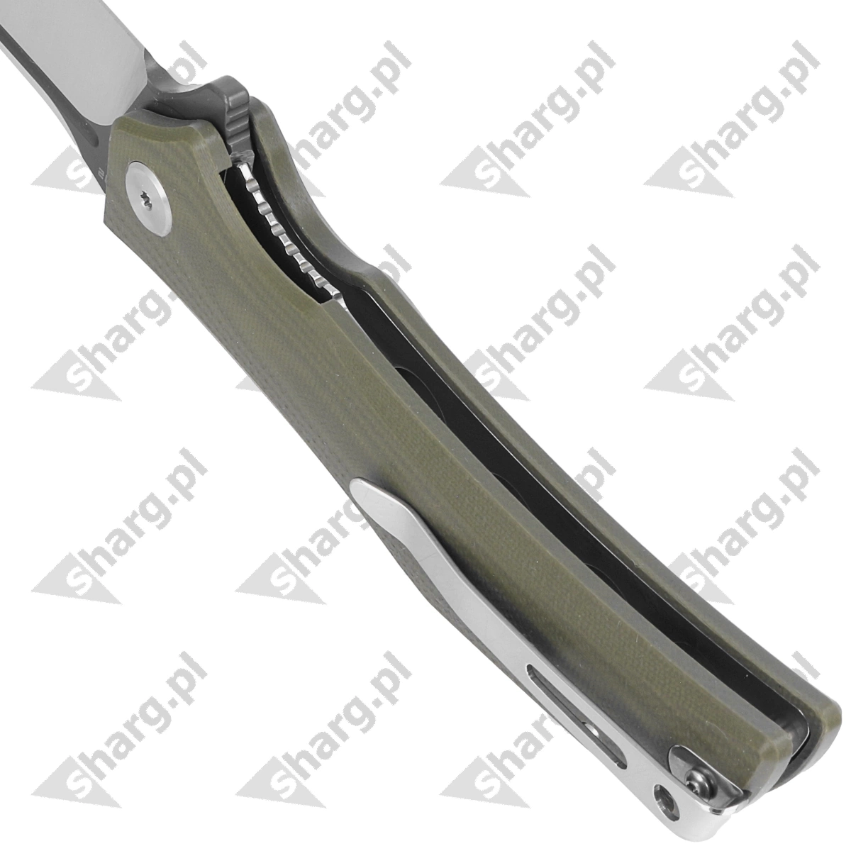 Handle - grips made of G10, a practically indestructible plastic insensitive to weather conditions, resistant to chemicals and mechanical damage Chamfered edges of the covers eliminate sharp edges and characteristic texturing of the surface improves grip security. The so-called open-backed design without the typical backspacer, fastened together with steel spacer sleeves for easy cleaning. The simple, sturdy design provides assurance of many years of use. The single-position, right-handed clip allows the knife to be carried in the tip-up position, with the tip of the blade upward. Above the clip, a hole for threading a safety or decorative cord.