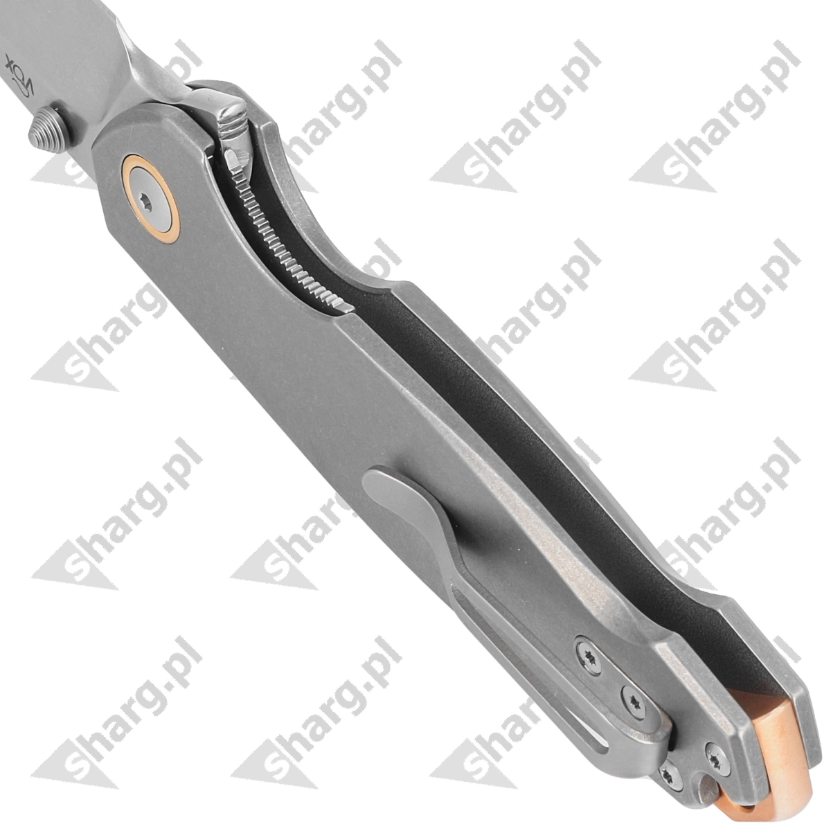 Handle - sandblasted titanium grips joined together using a CNC-milled backspacer, so the knife retains the desired rigidity of construction. The backspacer and the decorative ring around the pivot, the so-called pivot collar, are made of phosphor bronze (phosphor bronze). The fore finger groove, made on the front, improves grip security, while at the same time forming a guard with the flipper to prevent the hand from slipping on the blade. A right-handed, single-position titanium deep-carry clip allows the knife to be carried discreetly in the tip-up (tip up) position. At the end of the Handle lanyard hole, a hole for a cord.