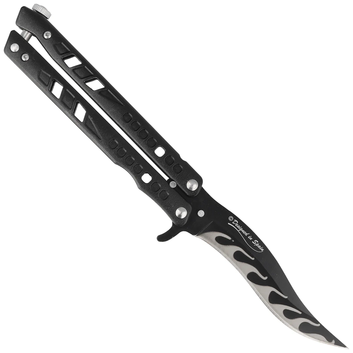 - Flamas Black Aluminium, Black (Single Edge), a sturdy butterfly type folding knife from the Spanish company Martinez Albainox. Black coated aluminium handle arms, blade with single edge.