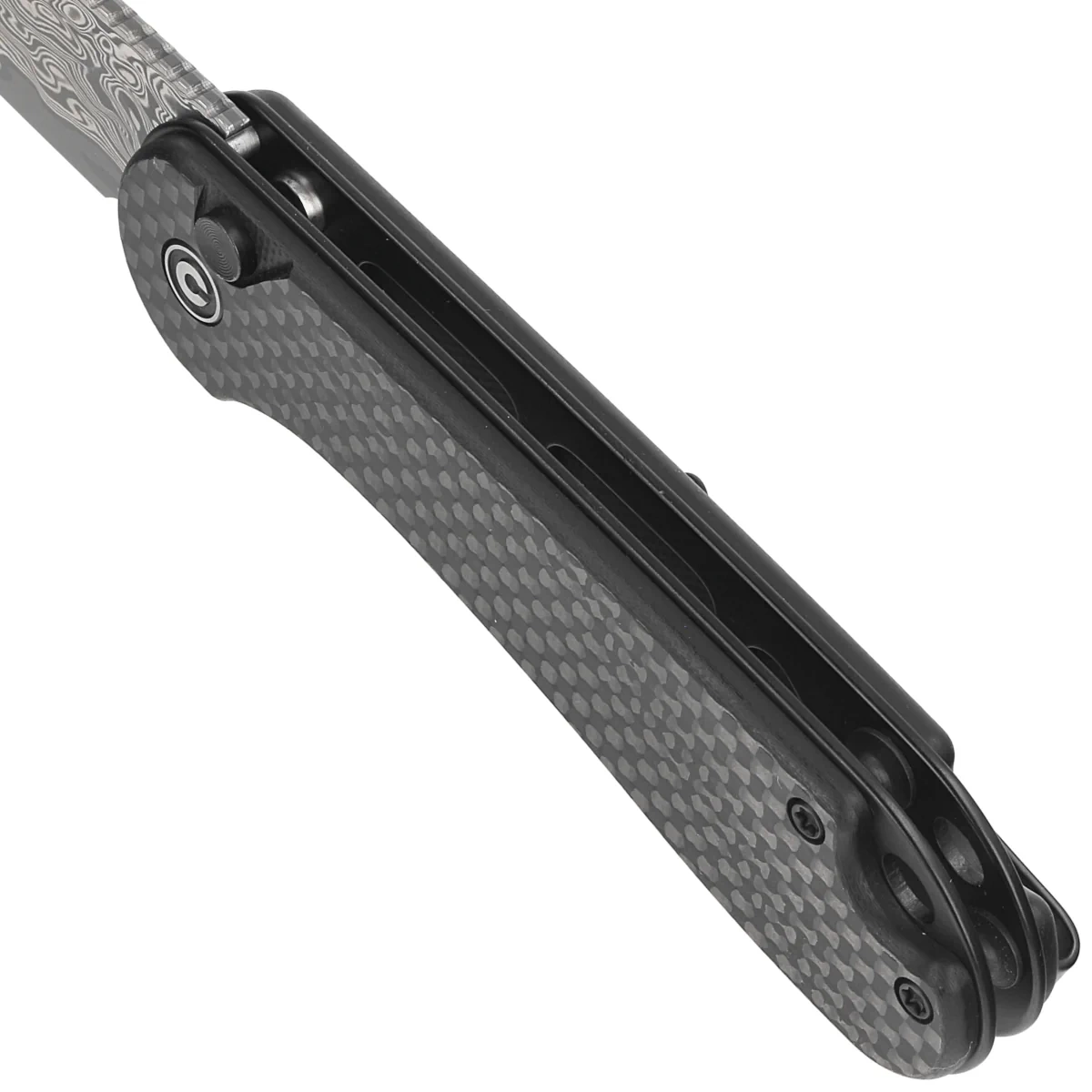 Handle - textured covers in black color made of G10, a composite material of fiberglass and synthetic resin laminated with Carbon Fiber (carbon fiber). All attached to stainless steel liners. The simple, sturdy design gives the assurance of many years of use. Open-backed design fixed with steel spacer sleeves reduces weight and facilitates cleaning. The pivot axis is decorated with a stylized Civivi brand logo. Metal one-sided (right) deep-carry clip allows you to carry the knife discreetly in your pocket in tip-up position (blade tip up).