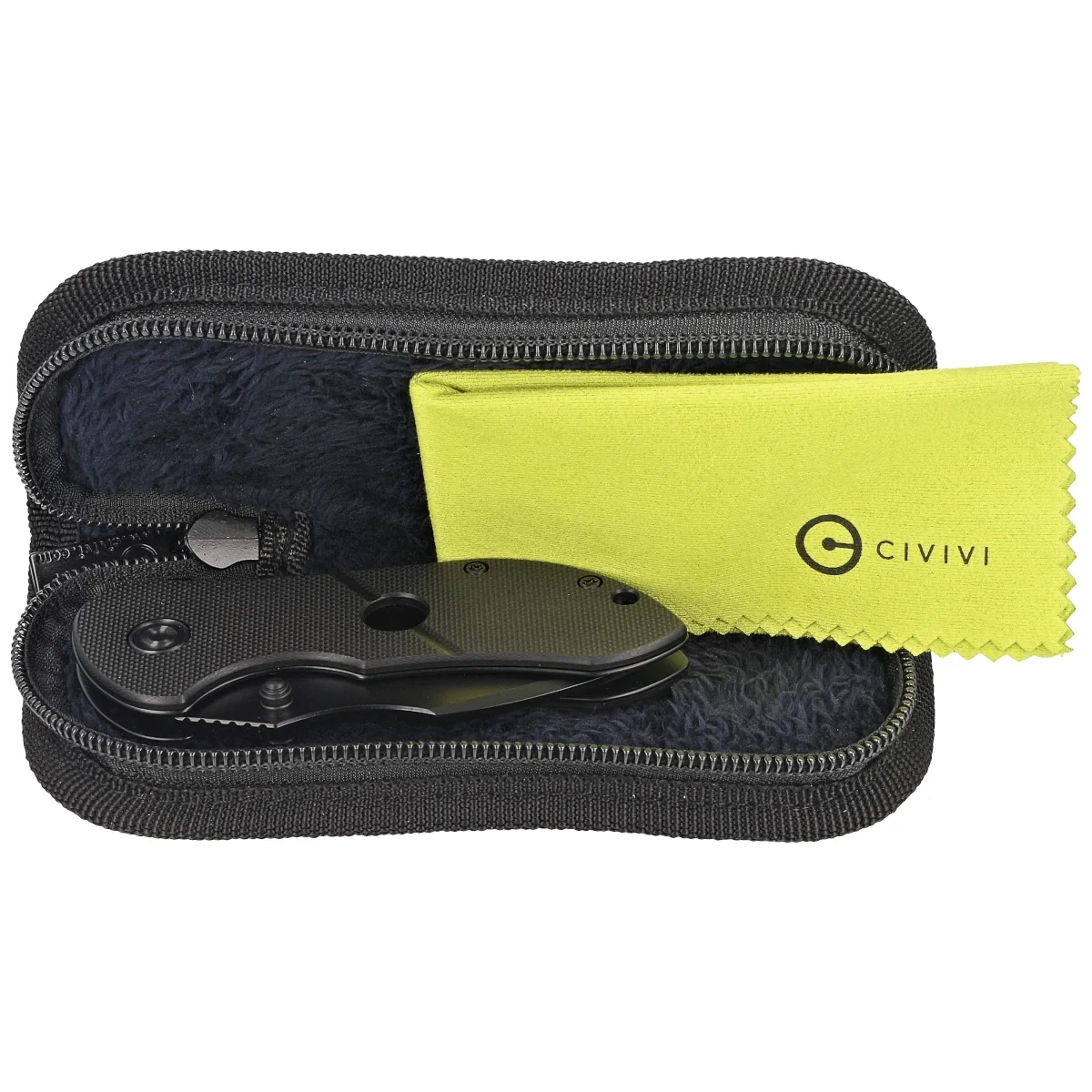 Sheath – the set includes a soft nylon pouch with a zipper and the manufacturer’s logo, designed for safe storage and transport of the folding knife.