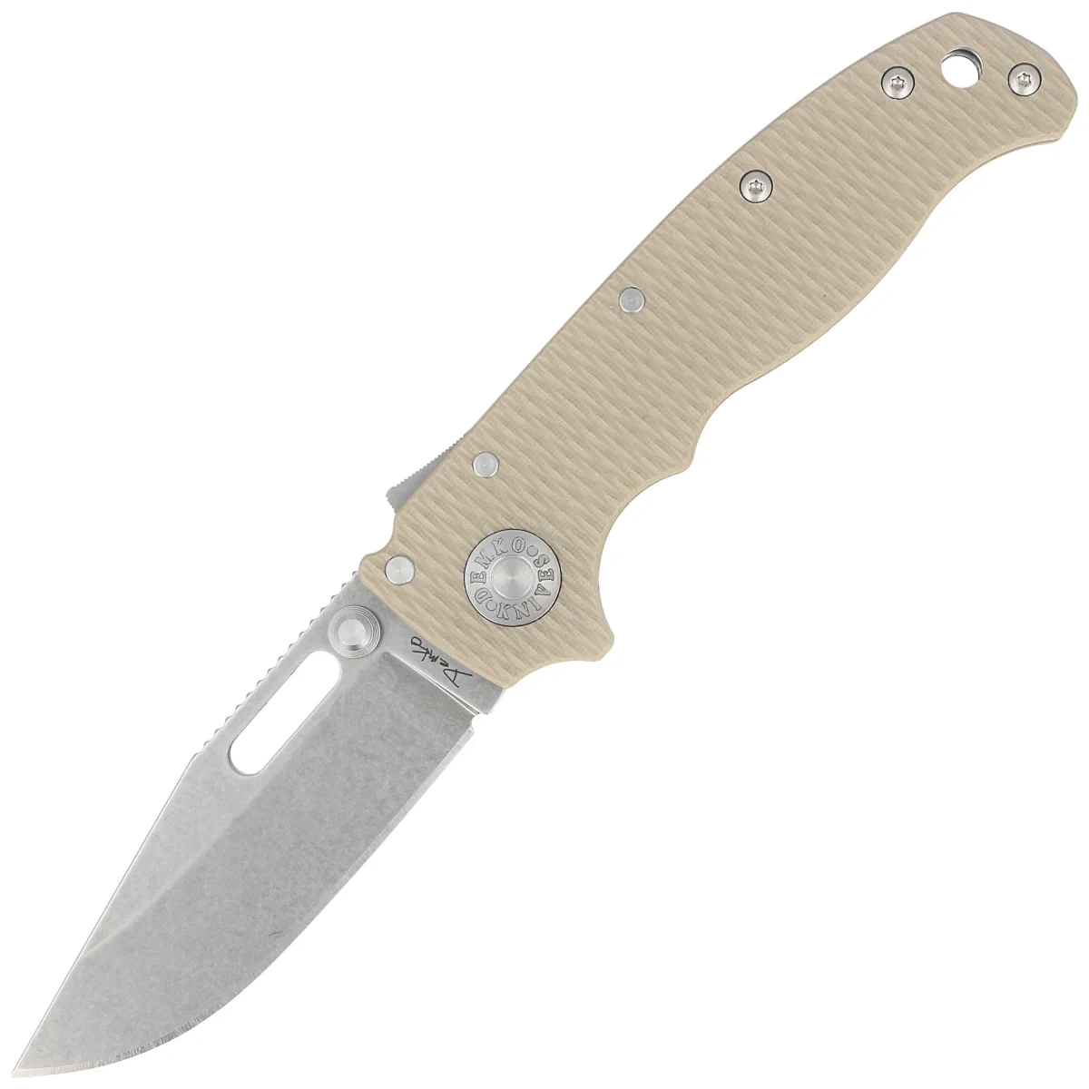• Demko AD20.5 Clip Point Coyote Tan G10, Stonewashed 3V rugged and sturdy EDC folding knife for hard work. Designed by Cold Steel's longtime designer, Andrew Demko. Its Shark-Lock™ lock is considered the strongest in the world!