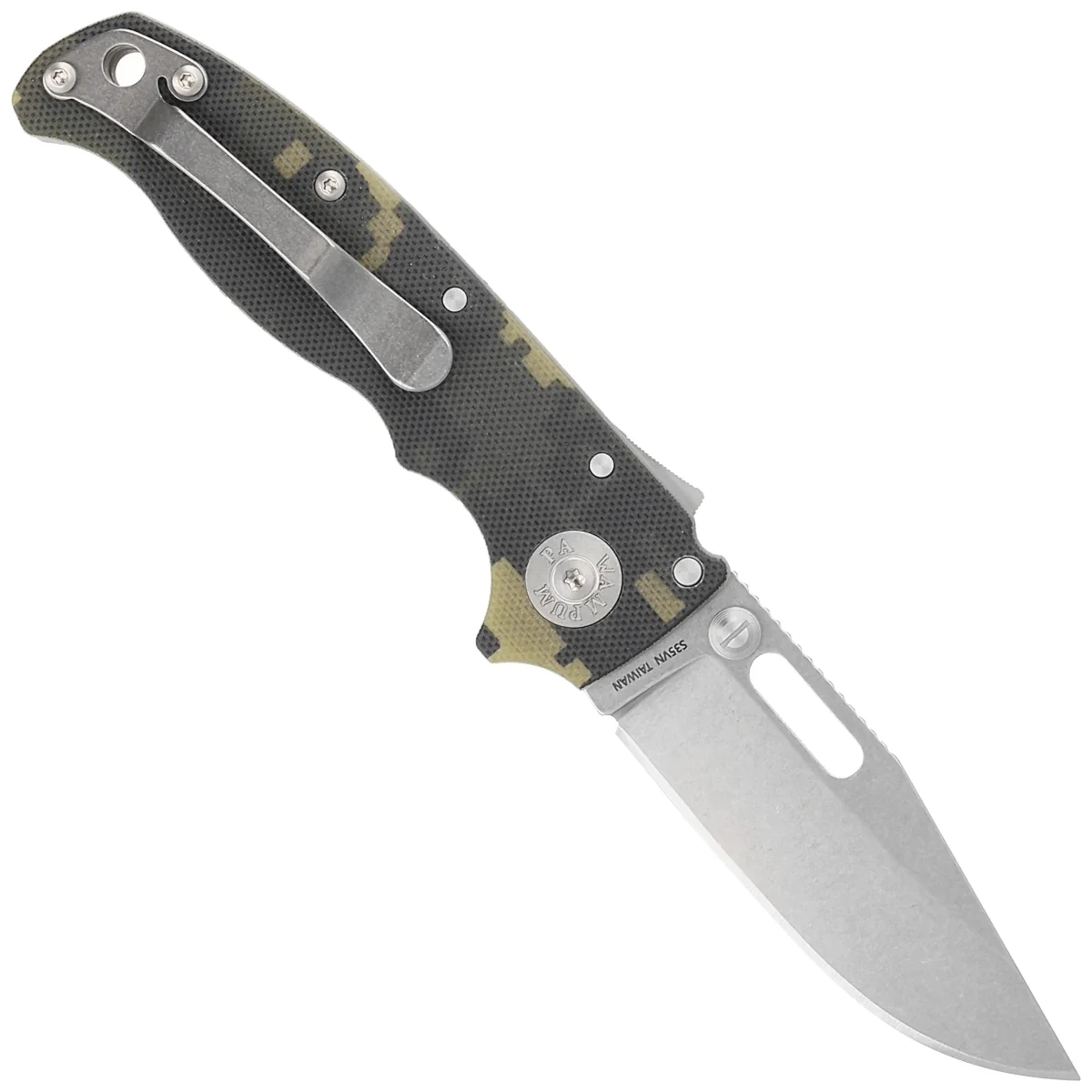 Handle - scales in digital camouflage made of G10, a virtually indestructible plastic that is insensitive to weather conditions, resistant to chemicals and mechanical damage. Chamfered edges of the covers eliminate sharp edges and characteristic surface texturing improves grip confidence. A single-position, right-handed clip allows the knife to be carried in the tip-up position, with the tip of the blade upward. A left-handed clip is included.