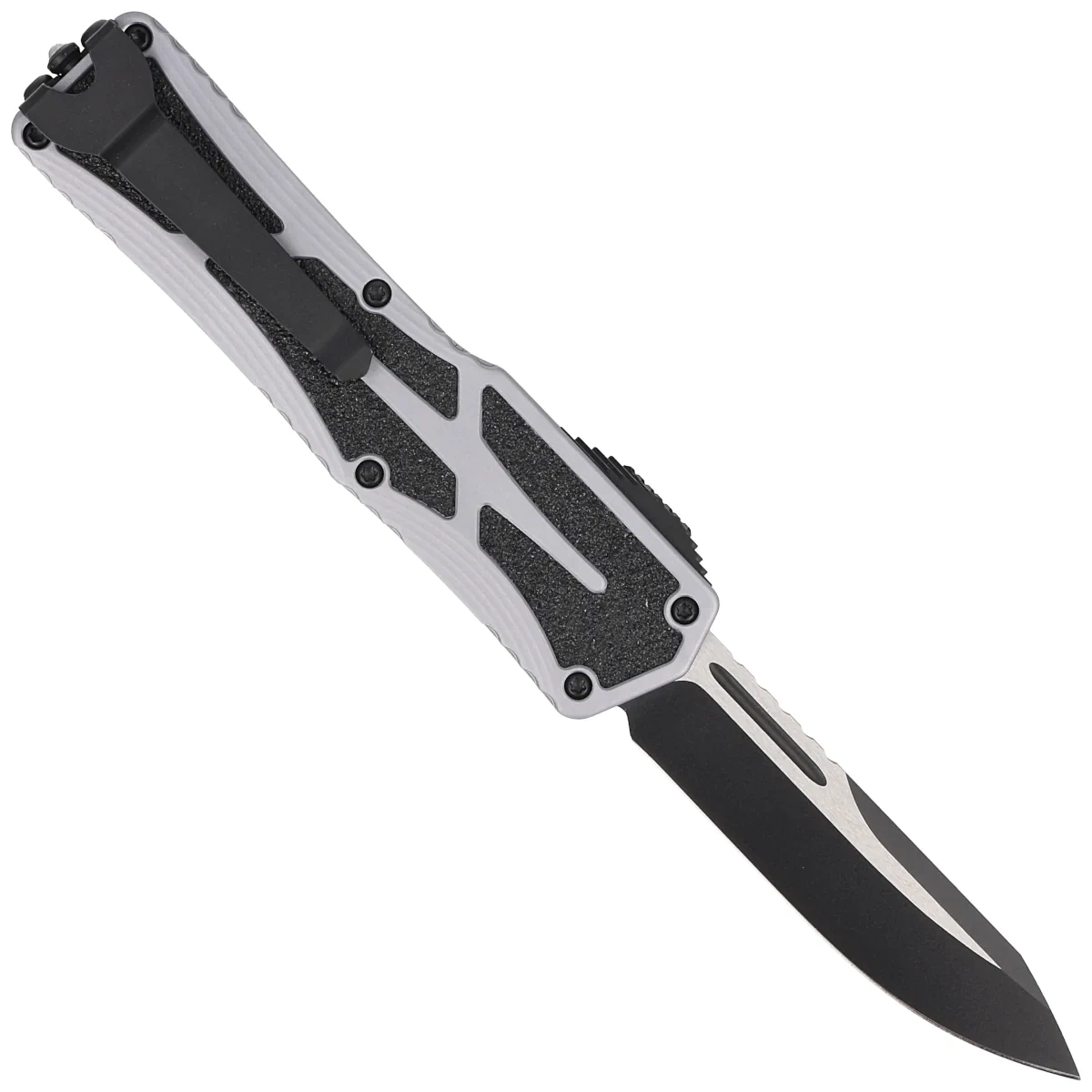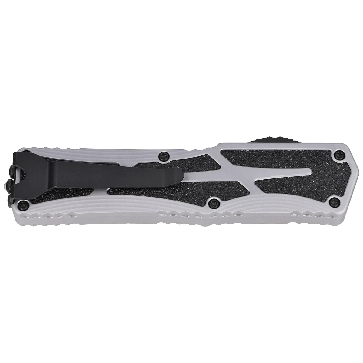 Colossus Single Edge Gray Aluminum, Cerakote Two-Tone Black, Black HW/Clip has a secure place in the Heretic Knives OTF line of automatic knives. The mechanism, which operates with great strength and power, uses a patent-pending slide action. Ball bearings used reduce friction for fast, smooth blade locking. Grip enhancing inserts on both sides of the Handle give remarkable style as well as functionality. The double-sided clip makes this an ideal knife for right- or left-handed users.