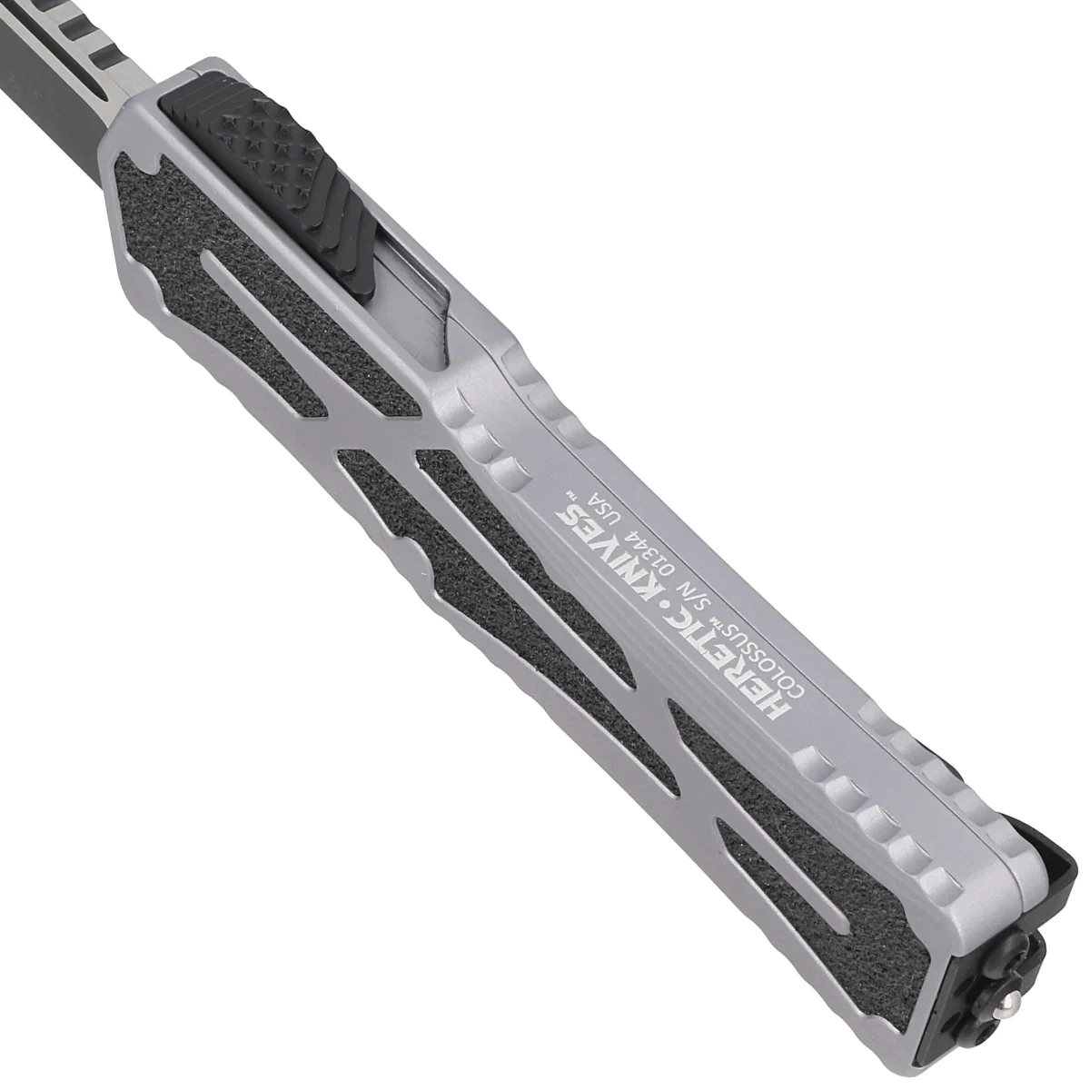 - Colossus Single Edge Gray Aluminum, Cerakote Two-Tone Black Magnacut. Automatic OTF knife operating in D/A (Double Action) mode with a slider to extend and retract the blade. Customised version by Anthony Marfione Jr., owner of Heretic Knives!