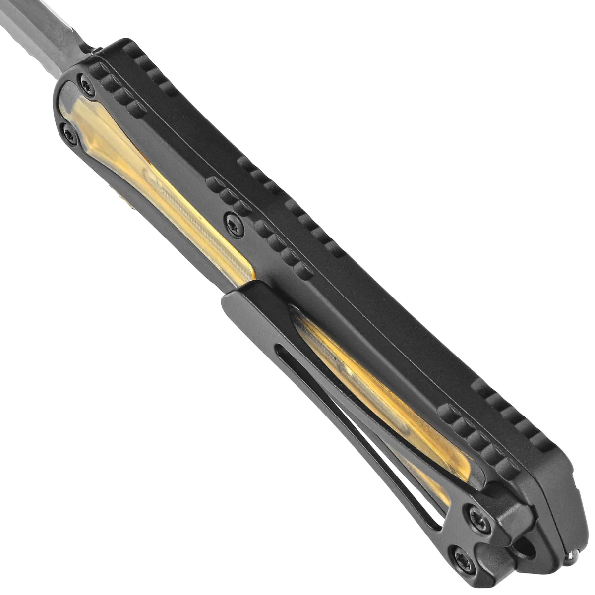 Handle - made on CNC milling machines with perfect precision, from black DLC-coated 6061-T6 aluminium. Perfectly fitting liners made of the innovative Ultem™ material. The same material is used for the opening and closing slide of the knife. Handle texture ensures that the knife does not slip in the hand during use. There are notches (jimping) on the back and bottom of the handle for a more secure grip. The slim design allows the knife to be tucked into any pocket. A solid two-position (right/left) deep carry clip allows the knife to be carried in a tip-down position. The Handle is finished with a glass breaker.