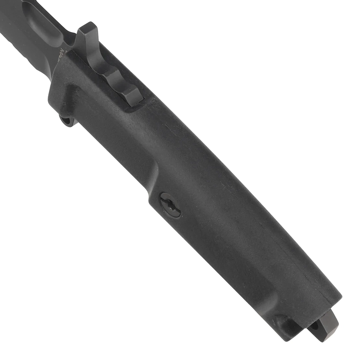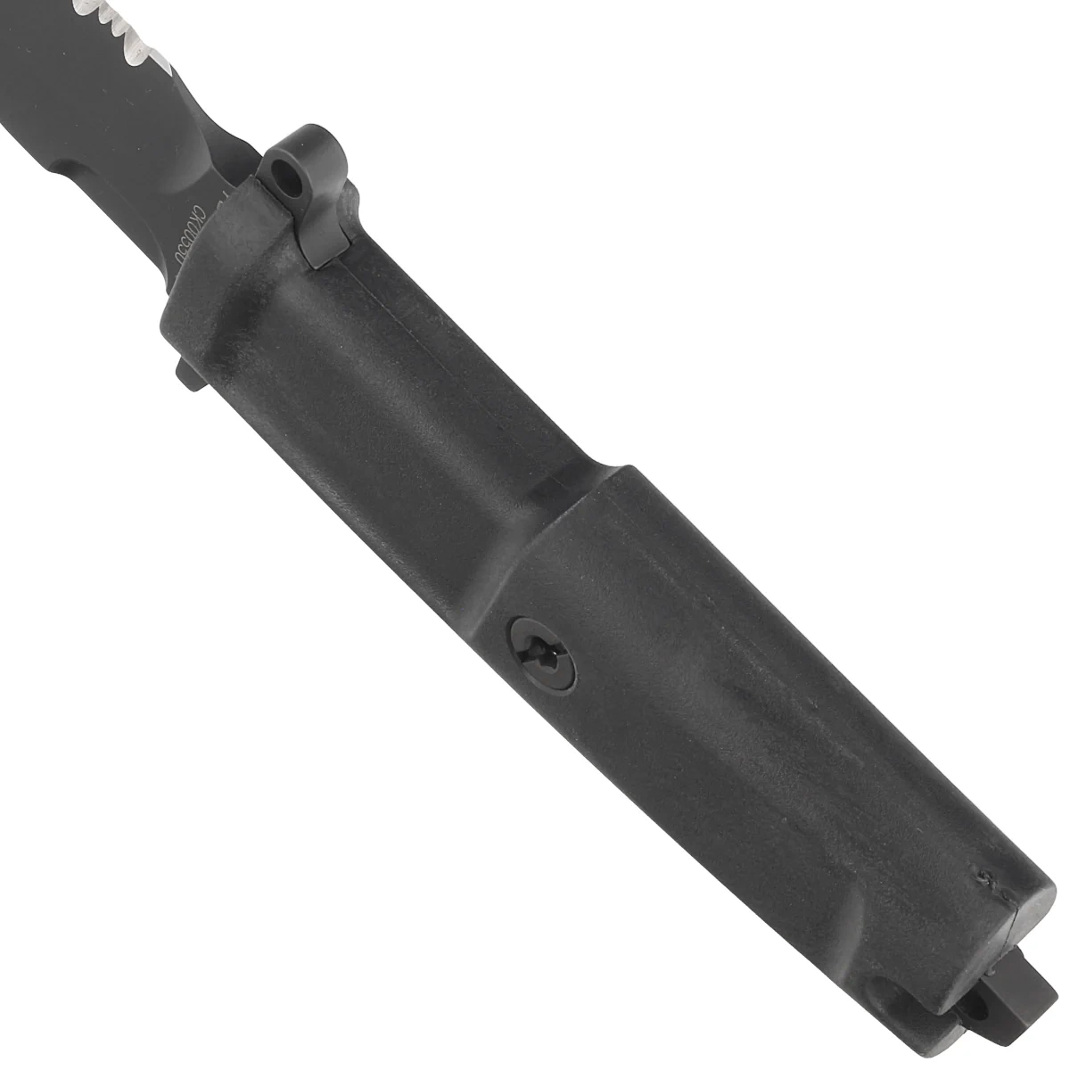 Sheath - made of injection-moulded nylon in black for safe carrying and quick retrieval of the knife. Three options for adjusting the carrying angle of the case (horizontal, vertical and 45° diagonal). The holster is equipped with a single, automatic, pressure-activated safety device for quick grip and removal of the knife. The holster's attachment allows it to be quickly clipped on/off. It fits 32-46mm wide belts and, with the adjustment removed, also fits most police belts. In order to prevent the sheath from moving on the belt, the holder is equipped with two adjustment screws.